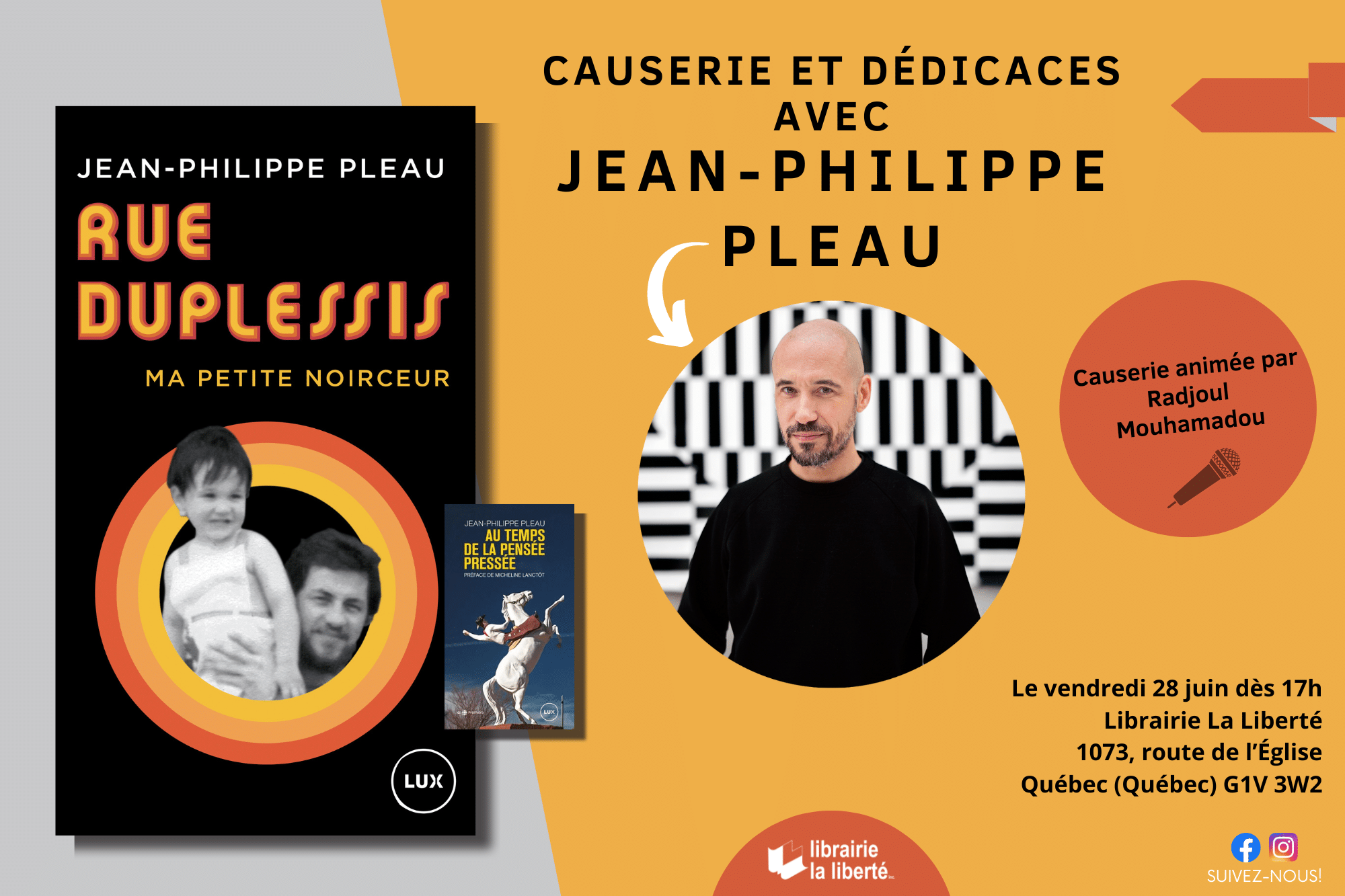 Rencontrez l’auteur Jean-Philippe Pleau lors d’une causerie à propos de son plus récent essai, « Rue Duplessis : Ma petite noirceur » (Lux Éditeur, avril 2024). Les échanges, animés par notre libraire Radjoul Mouhamadou, seront suivis d’une séance de dédicaces.