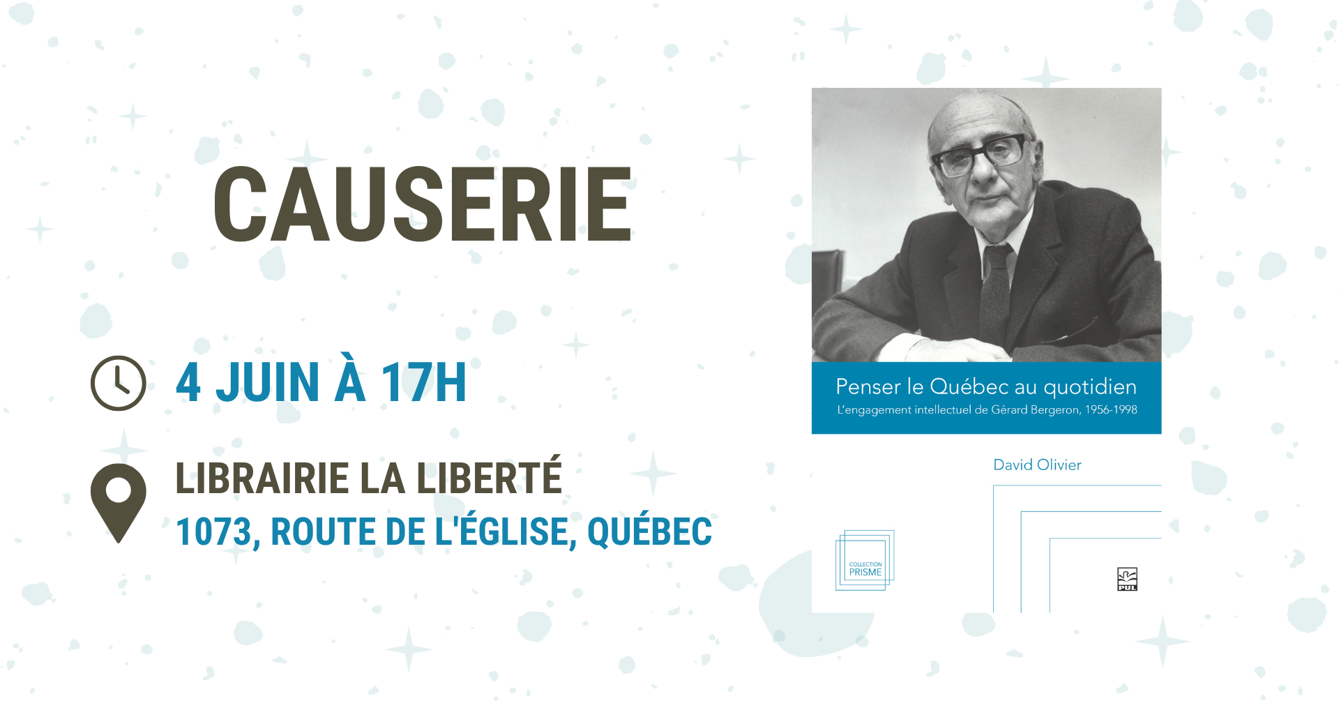 Vous êtes invité·e·s le 4 juin prochain à 17 h, à la Librairie La Liberté (1073, route de l’Église, Québec), pour une causerie autour du livre « Penser le Québec au quotidien : l’engagement intellectuel de Gérard Bergeron (1956-1998) » de David Olivier.