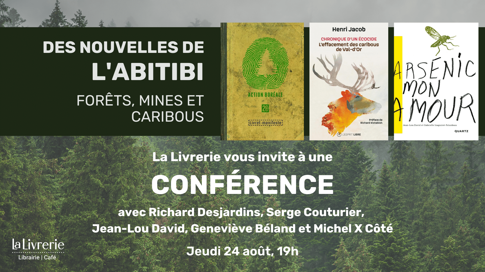 La Livrerie est fière de vous convier à une conférence s’organisant autour de l’Action boréale et l’état actuel des grands enjeux environnementaux avec lesquels l’Abitibi doit aujourd’hui plus que jamais composer : déforestation, déclin fulgurant des populations de caribous forestiers, toxicité de l’arsenic et de l’exploitation des mines.
