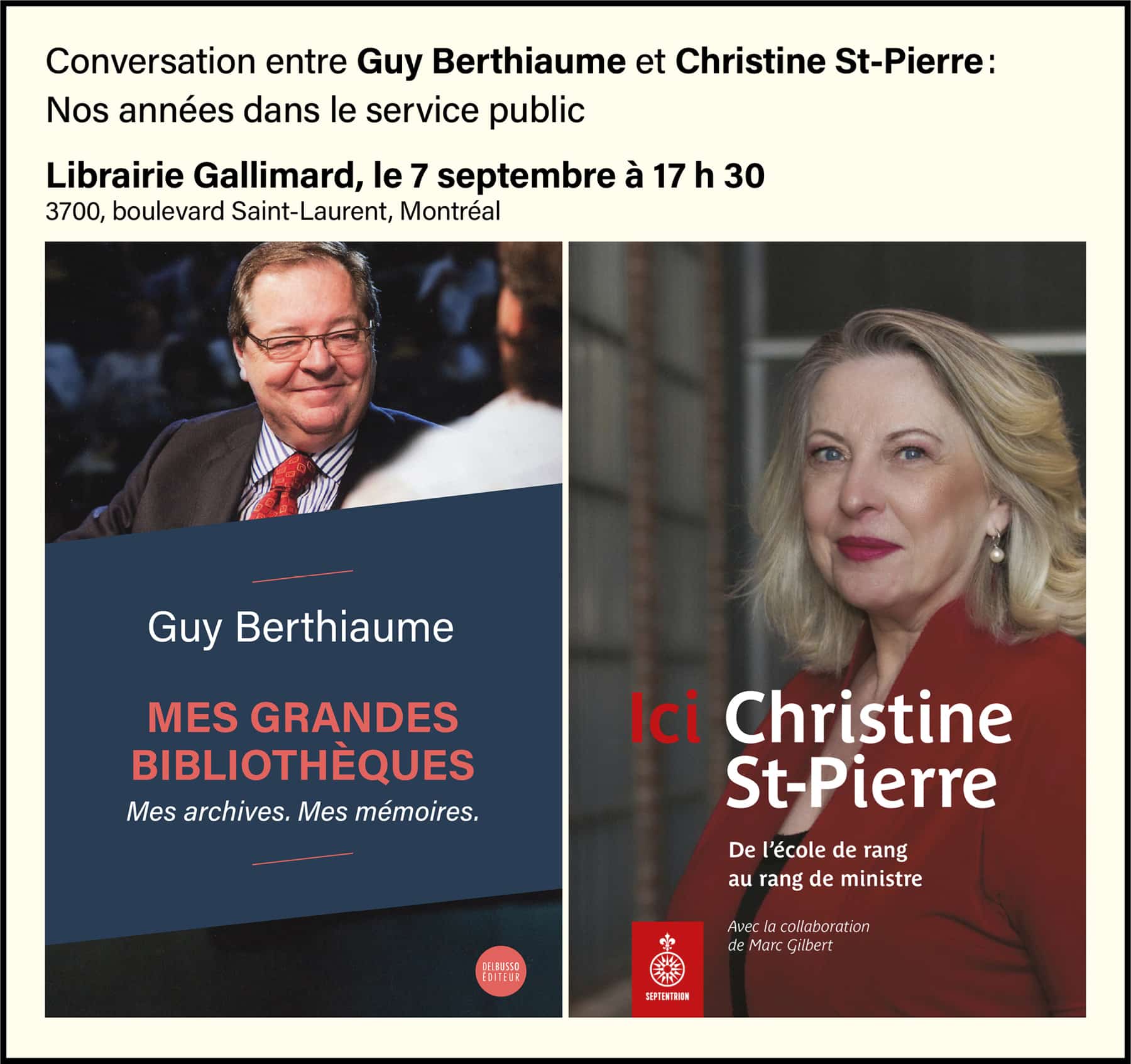 Guy Berthiaume, qui lançait récemment chez Del Busso «Mes grandes bibliothèques – Mes archives. Mes mémoires», s’entretiendra avec Christine St-Pierre à la librairie Gallimard le 7 septembre prochain.