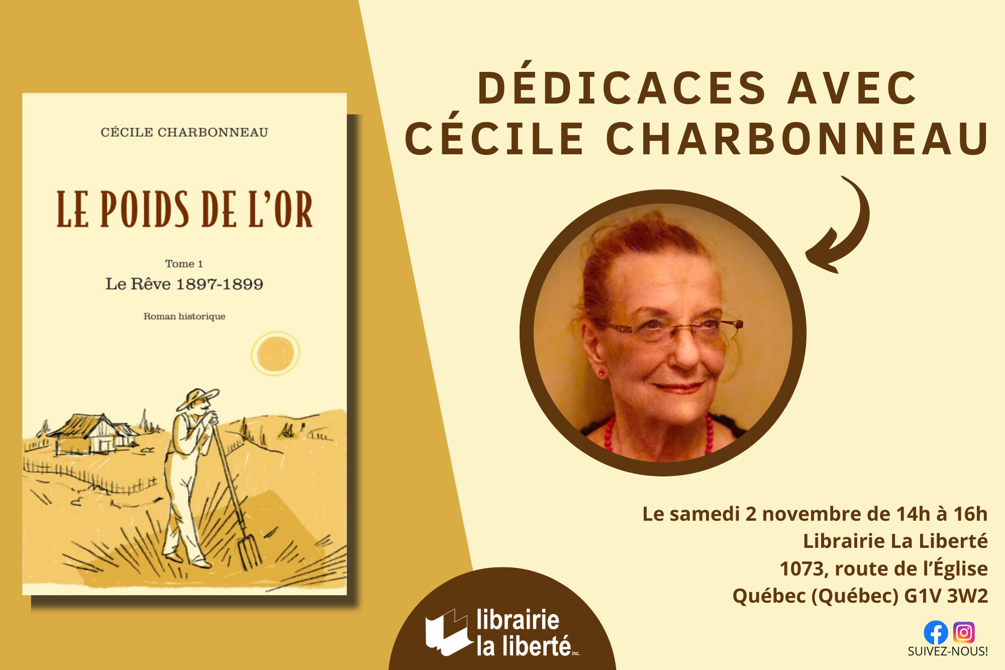 Rencontrez Cécile Charbonneau à la Librairie La Liberté lors d’une séance de dédicaces pour son roman « Le poids de l’or T.1 : Le rêve : 1897-1899 » (juin 2024).
