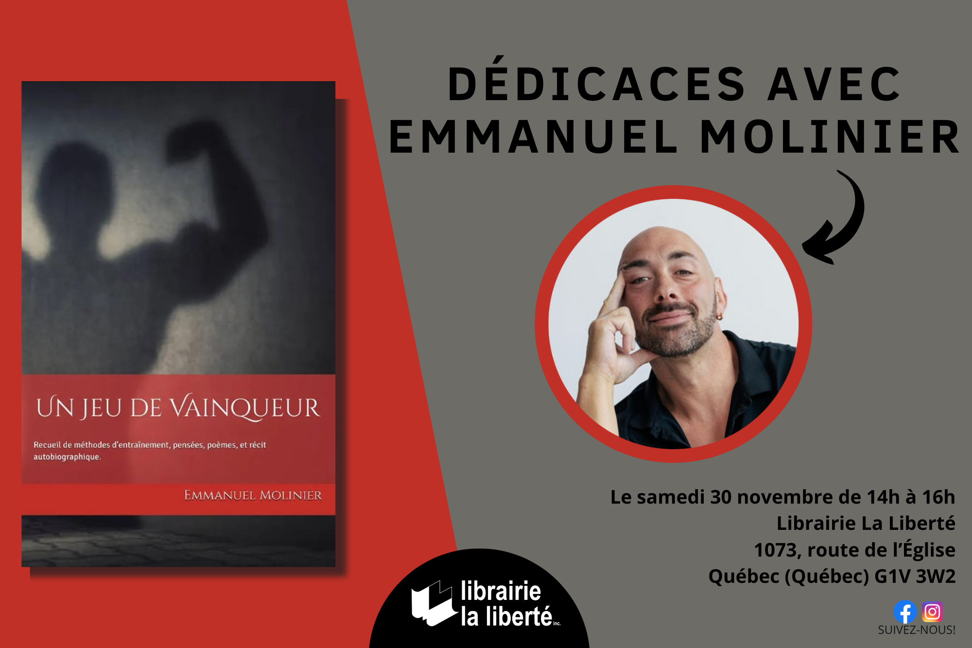 Rencontrez Emmanuel Molinier à la Librairie La Liberté lors d’une séance de dédicaces pour son livre « Un jeu de vainqueur : Recueil de méthodes d’entraînement, pensées, poèmes et récit autobiographique » (2024).