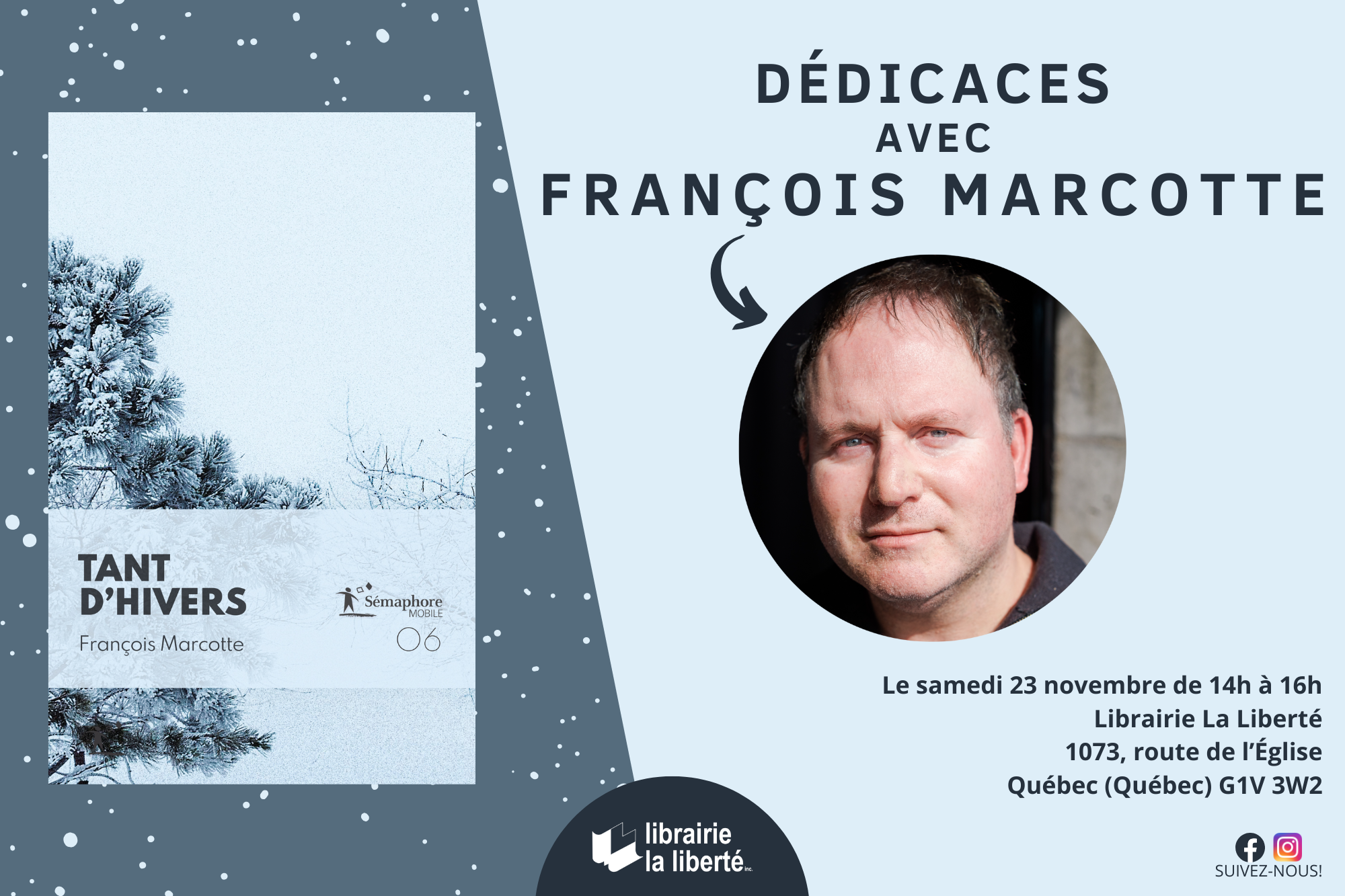 Venez rencontrer François Marcotte à la Librairie La Liberté lors d’une séance de dédicaces pour son livre « Tant d’hivers » (Sémaphore, 2024).