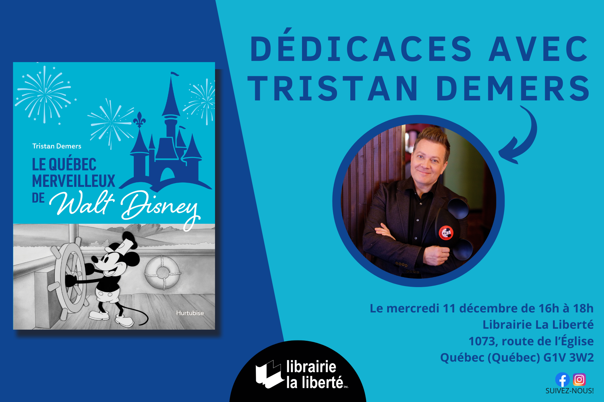 Rencontrez Tristan Demers à la Librairie La Liberté lors d’une séance de dédicaces, principalement pour le livre « Le Québec merveilleux de Walt Disney » (Hurtubise, octobre 2024).