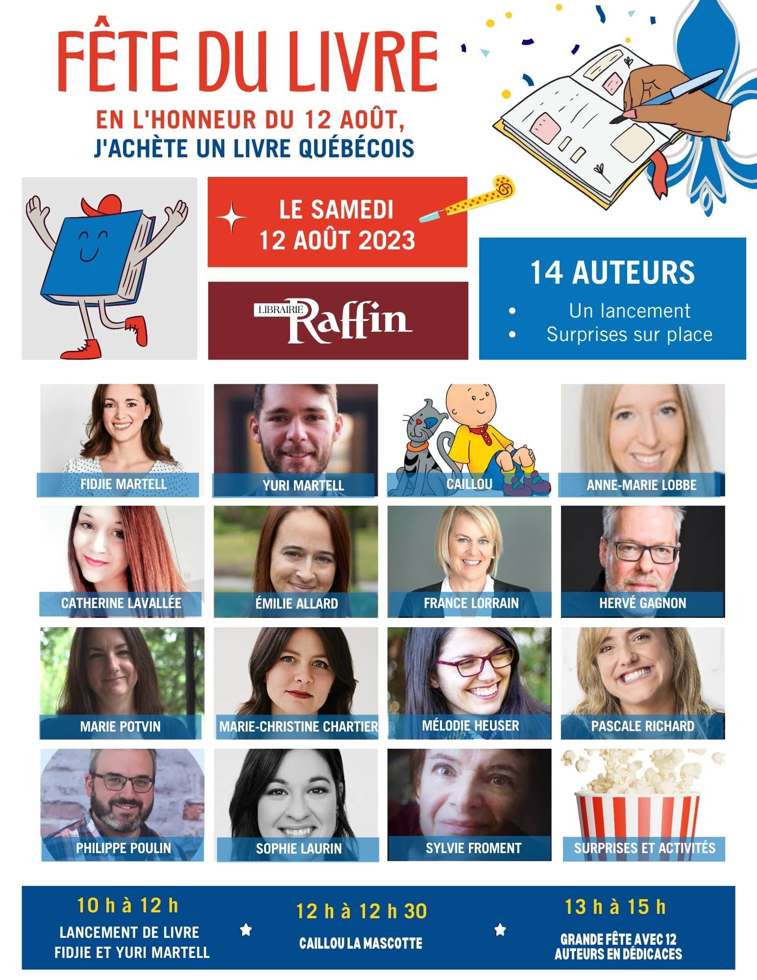 ❤️Raffin | Repentigny : De 10 h à 12 h – Lancement de livre avec l’autrice Fidjie Martell et l’illustrateur Yuri Martell. À 12 H présence de Caillou, la mascotte. De 13 h à 16 h présence de 11 auteurs : Catherine Lavallée, Émilie Allard, France Lorrain, Hervé Gagnon, Marie Potvin, Marie-Christine Chartier, Mélodie Heuser, Pascale Richard, Philippe Poulin, Sophie Laurin, Sylvie Froment. Surprises et activités pour les enfants seront au rendez-vous !