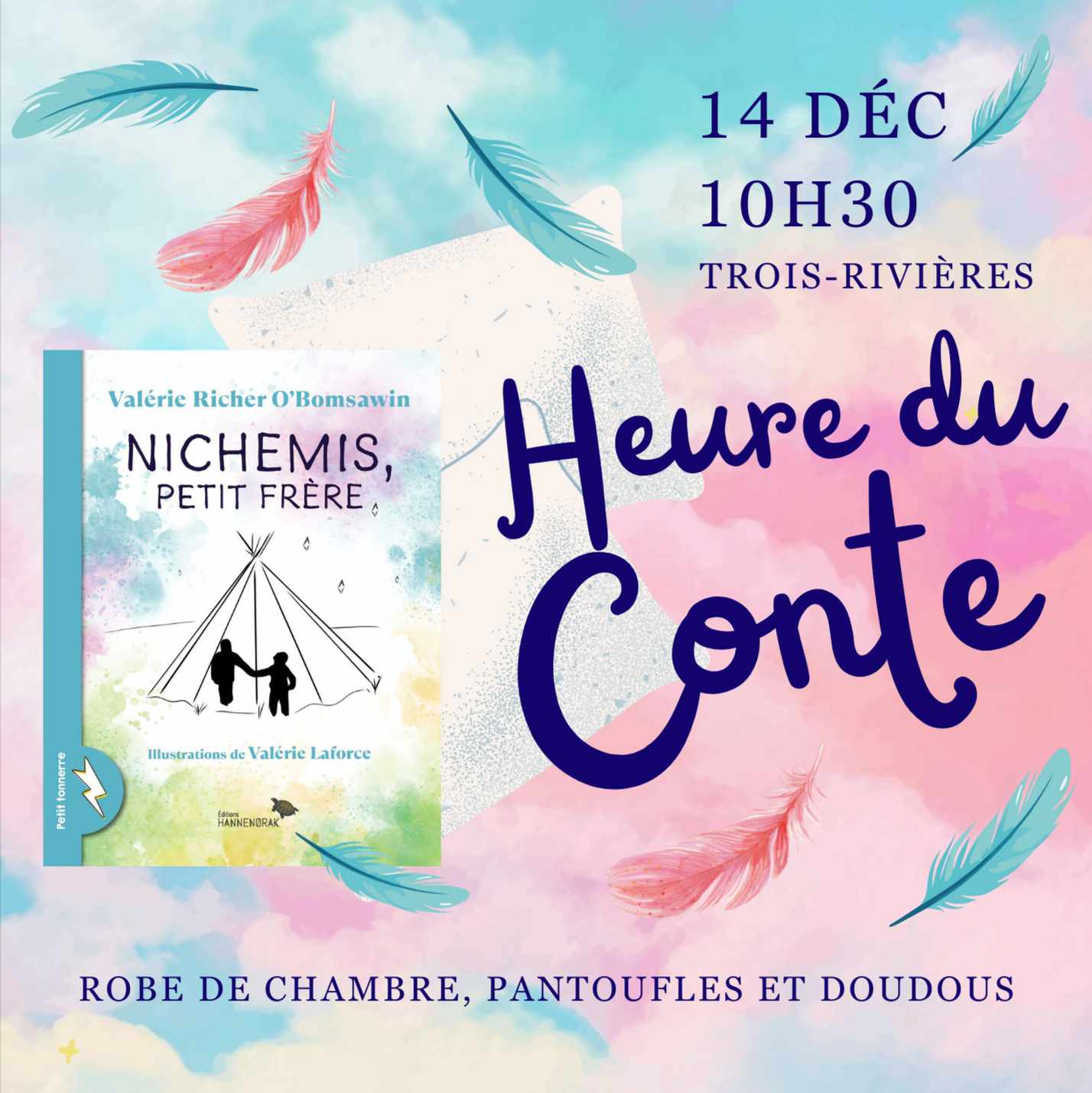 Envie d’une belle activité gratuite avec les enfants le samedi ? Venez assister une heure du conte animée par l’autrice Valérie Richer O’Bomsawin autour de son album jeunesse autochtone Nichemis, petit frère. Rendez-vous le 14 décembre à 10h30 à la succursale de Trois-Rivières! Pour vous mettre dans l’ambiance, nous vous recommandons d’apporter robe de chambre, pantoufles et doudous!