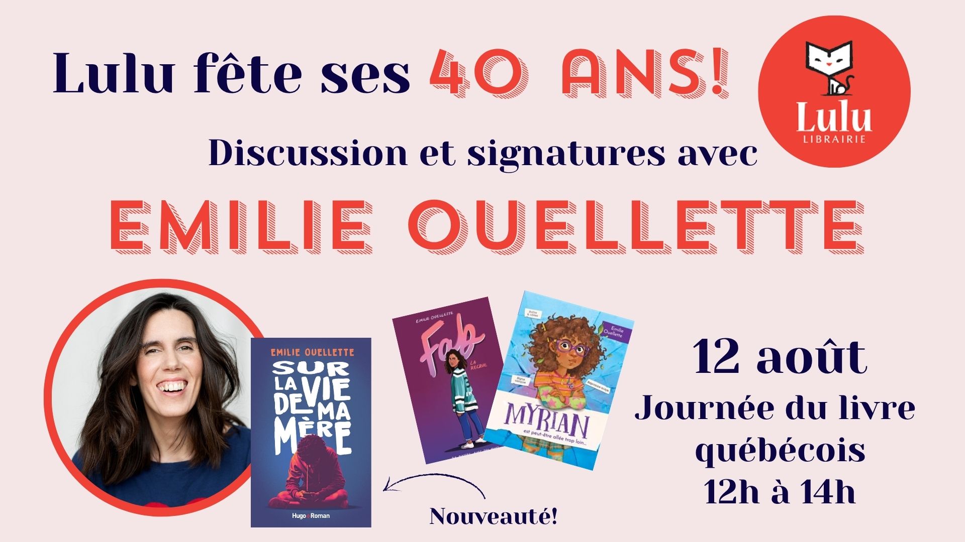 Nous avons la chance de recevoir Emilie Ouellette à la librairie Lulu pour célébrer la journée du livre québécois. Emilie est une auteure jeunesse qui a écrit de nombreux livre adorés de notre équipe. L’auteure sera présente pour discuter avec les ados (et les plus grands!) dans une ambiance de fête et pour dédicacer ses livres, dont son plus récent Sur la vie de ma mère. Joignez-vous à nous le 12 août de 12h à 14h pour un bel évènement en librairie.