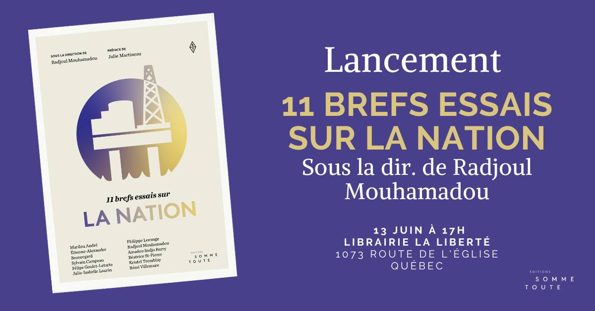 Les Éditions Somme toute ont le plaisir de vous inviter au lancement de l’ouvrage « 11 brefs essais sur la nation » dirigé par Radjoul Mouhamadou.