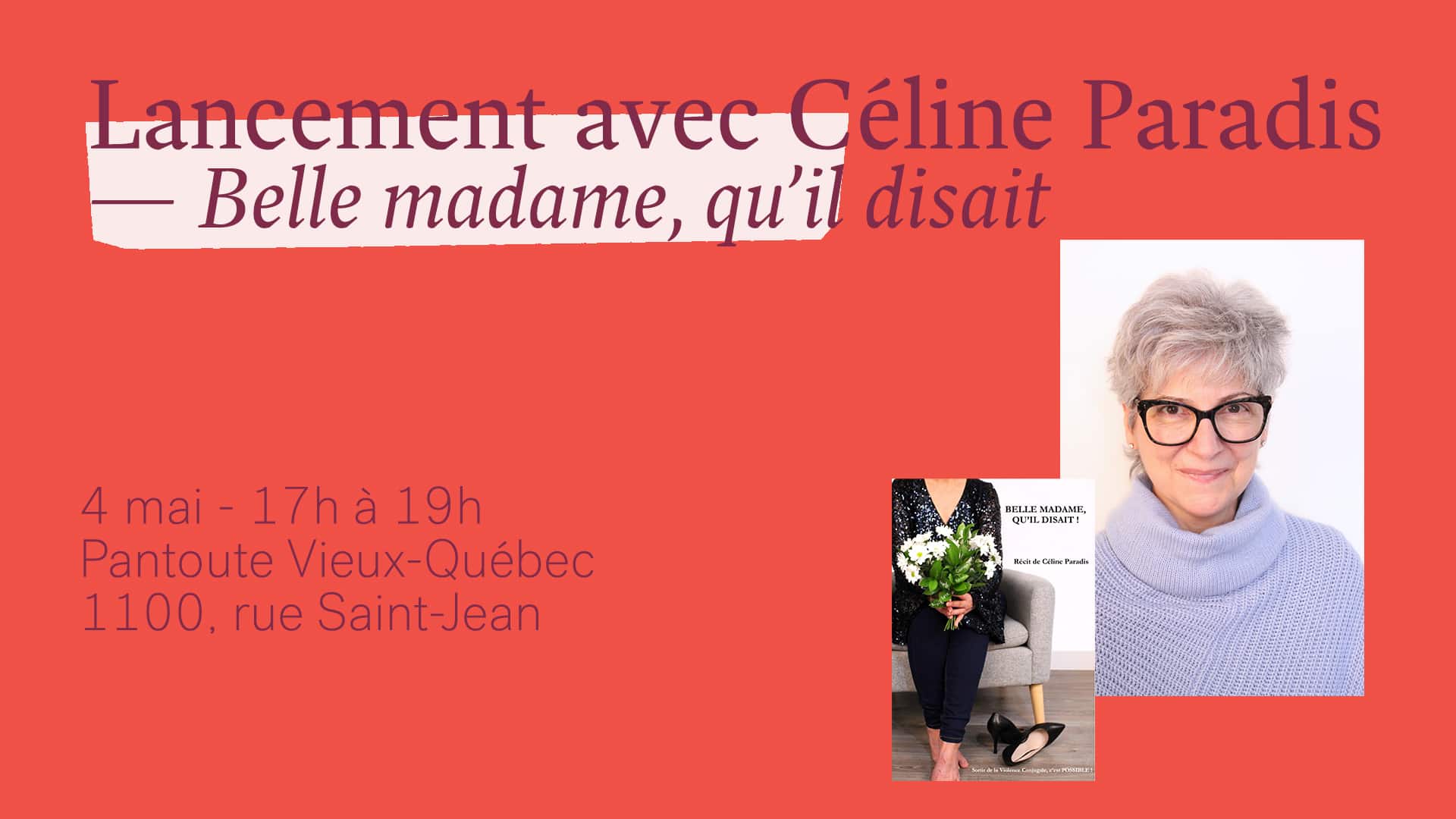 La Librairie Pantoute vous invite du lancement du livre Belle madame, qu’il disait! de Céline Paradis. 📖 Dans cet ouvrage, l’autrice témoigne de son parcours pour échapper à la violence conjugale. Elle y relate aussi les actions qu’elle pose au quotidien pour aider d’autres femmes à sortir de relations abusives. Son récit nous rappelle qu’il est possible de mettre terme à une telle situation. Nous vous attendons donc à notre succursale du Vieux-Québec dès 17h, le 4 mai prochain, pour une soirée de discussions et de dédicaces. Du vin sera servi à celles et ceux qui en désirent. 🍷 Les fonds recueillis par la vente du livre seront remis aux maisons d’hébergement pour femmes et enfants de la Capitale-Nationale.