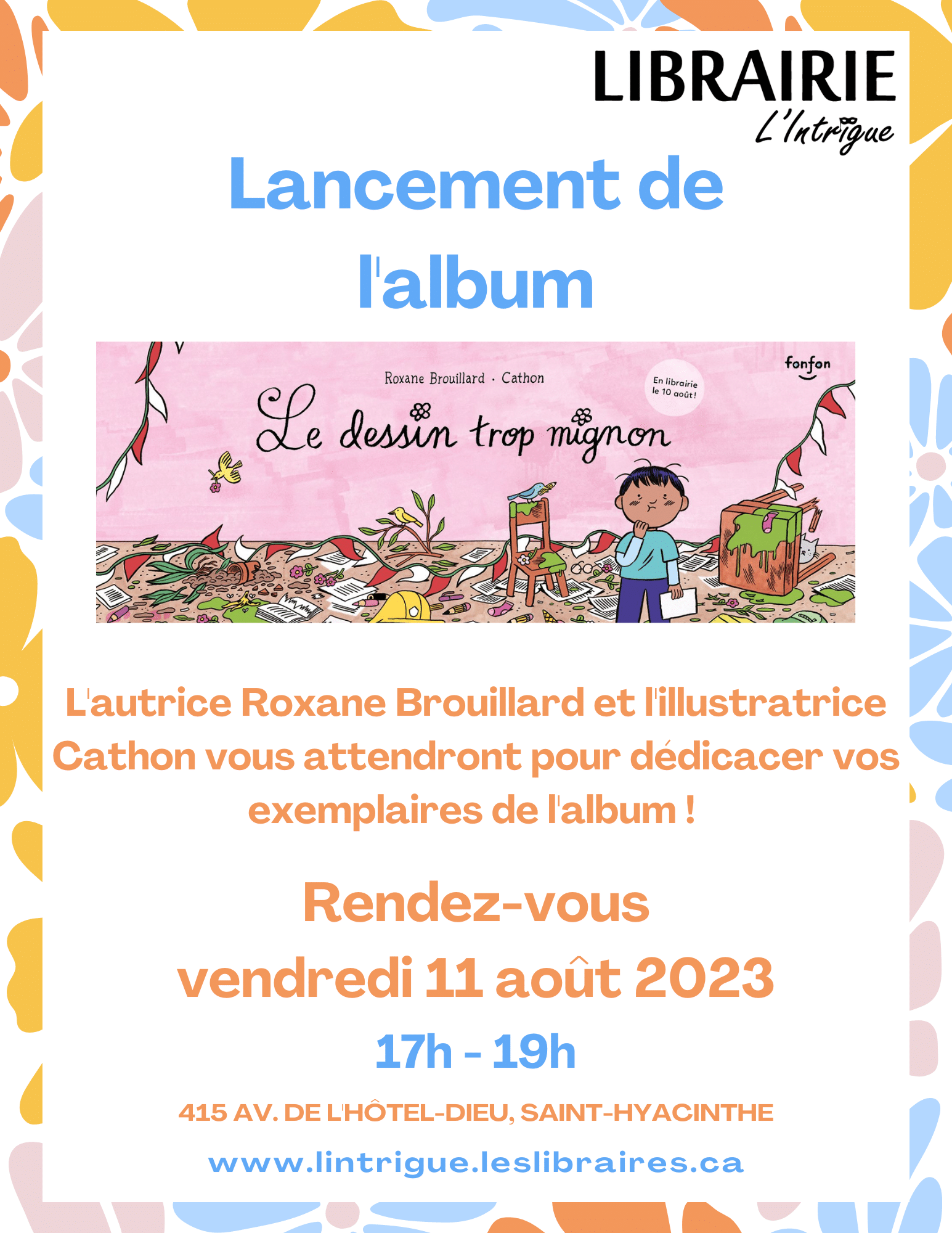 Venez célébrer avec nous la sortie de l’album Le dessin trop mignon à la librairie l’Intrigue de Saint-Hyacinthe ! ✨