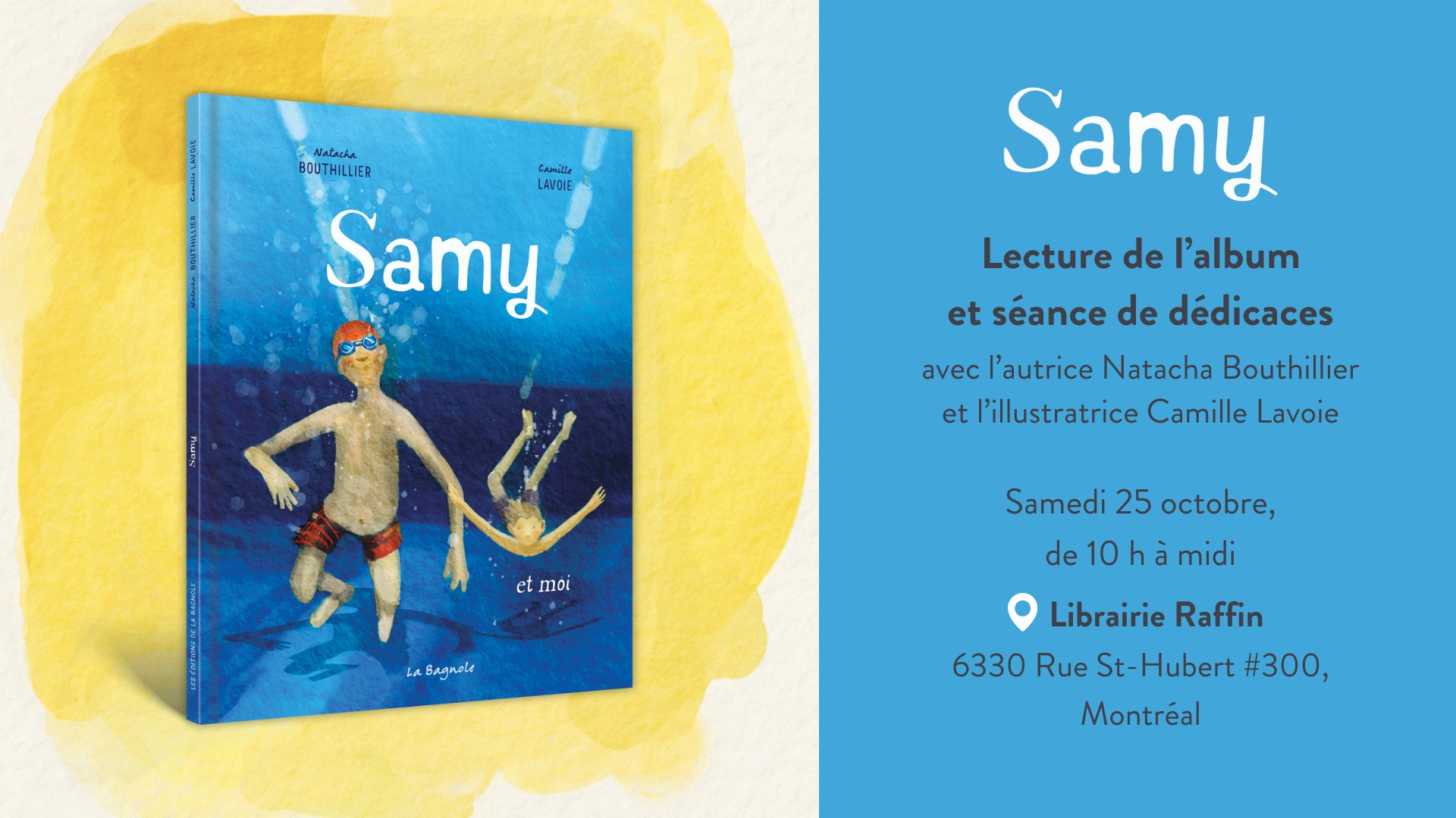 L’autrice Natacha Bouthillier et l’illustratrice Camille Lavoie vous invitent au lancement montréalais de leur magnifique album Samy.