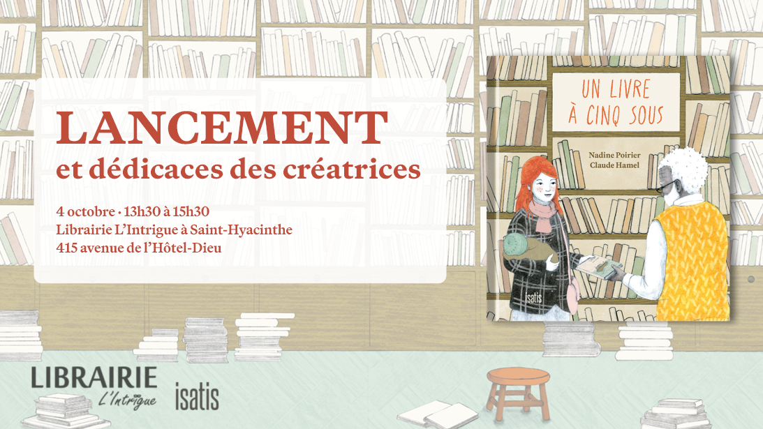 Moment de célébration en présence des créatrices à l’occasion de la parution de l’album jeunesse Un livre à cinq sous, le samedi 4 octobre à la librairie L’intrigue à Saint-Hyacinthe.