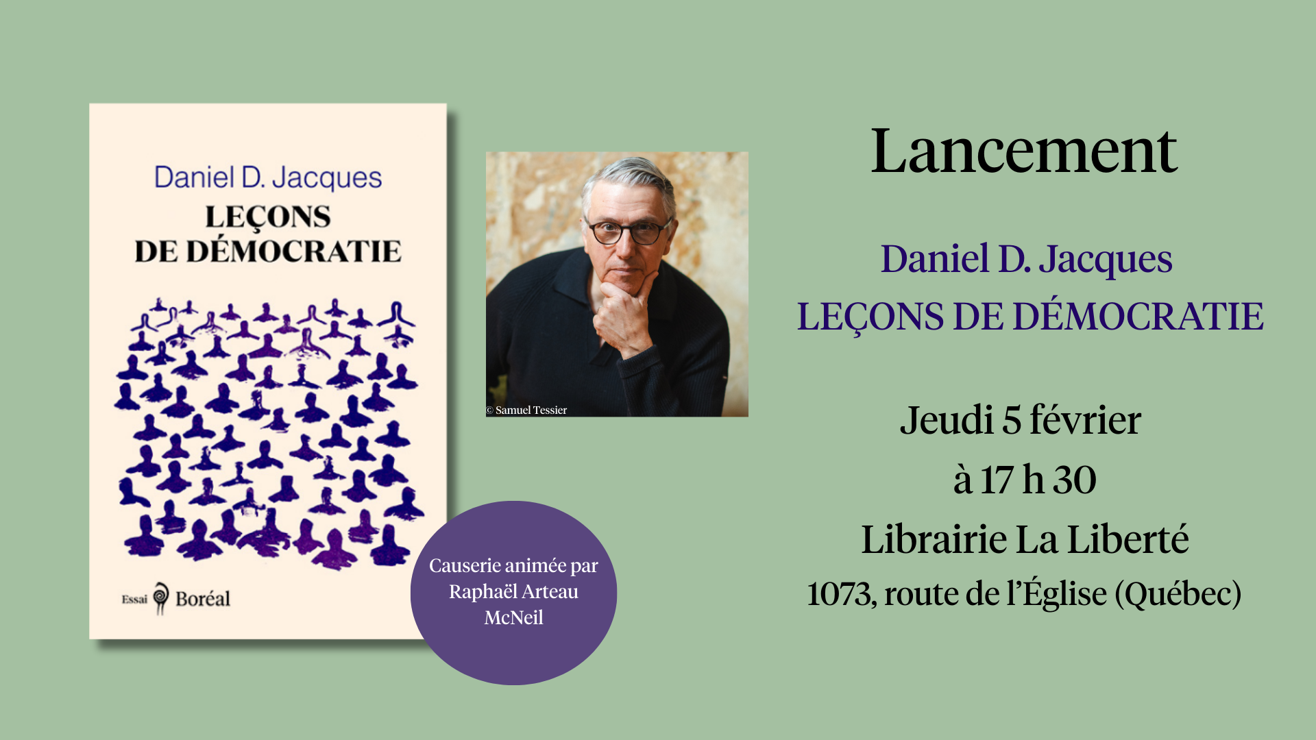 Les Éditions du Boréal et la Librairie La Liberté vous invitent au lancement de LEÇONS DE DÉMOCRATIE, le nouvel essai de Daniel D. Jacques.