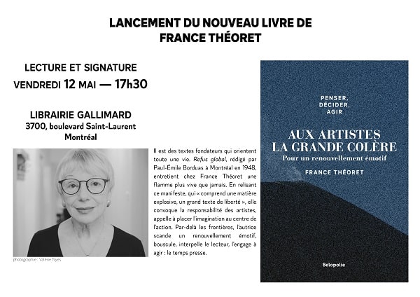 À l’occasion du lancement du nouveau livre de la grande France Théoret Aux artistes la grande colère : Pour un renouvellement émotif, les éditions Bélopolie et la Librairie Gallimard sont heureuses de vous convier à une soirée de lecture et de rencontre!