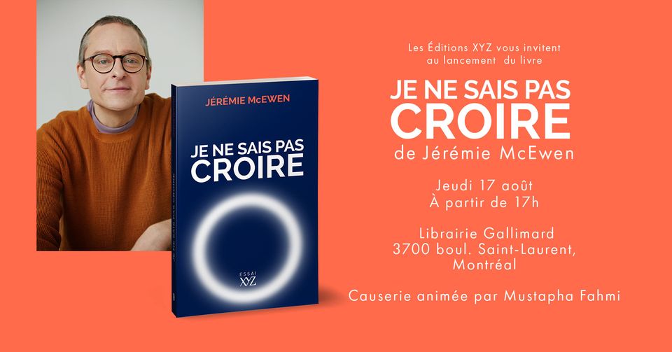 Les éditions XYZ sont heureuses de vous inviter au lancement du nouveau livre de Jérémie McEwen, Je ne sais pas croire. L’animation sera assurée par Mustapha Fahmi, auteur et professeur.
