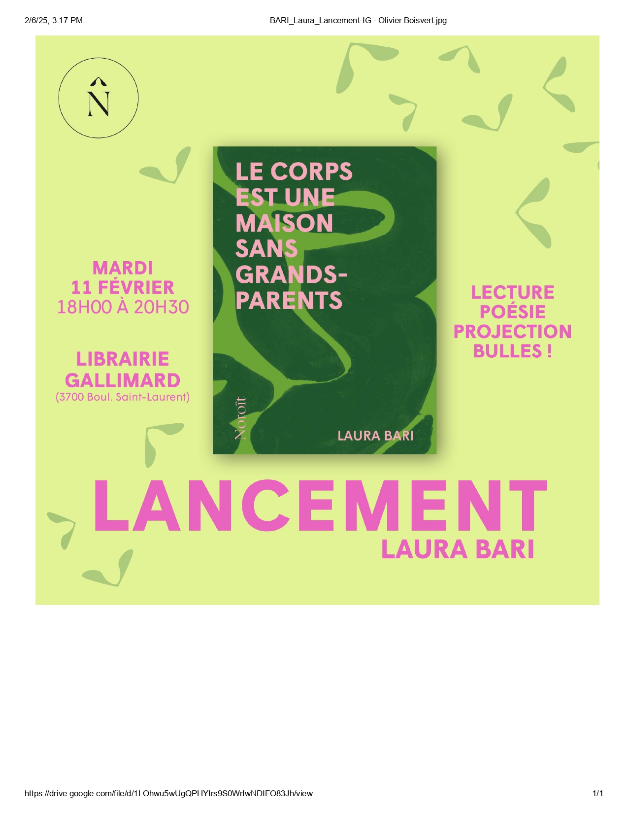 Lancement du premier recueil de poésie de Laura Bari « Le corps est une maison sans grands-parents » publié aux éditions du Noroît
