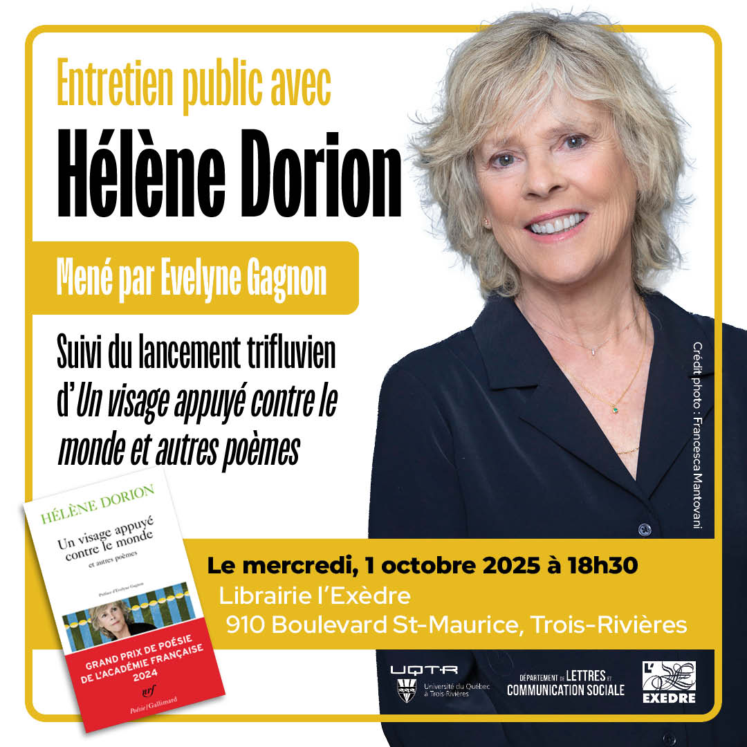 Poète, essayiste et romancière, Hélène Dorion est seulement la troisième Canadienne et Québécoise à entrer dans la prestigieuse collection Poésie/Gallimard, qui regroupe les plus grandes œuvres poétiques. Son ouvrage Un visage appuyé contre le monde et autres poèmes, préfacé par Évelyne Gagnon, rassemble quatre livres majeurs de son œuvre monumentale.