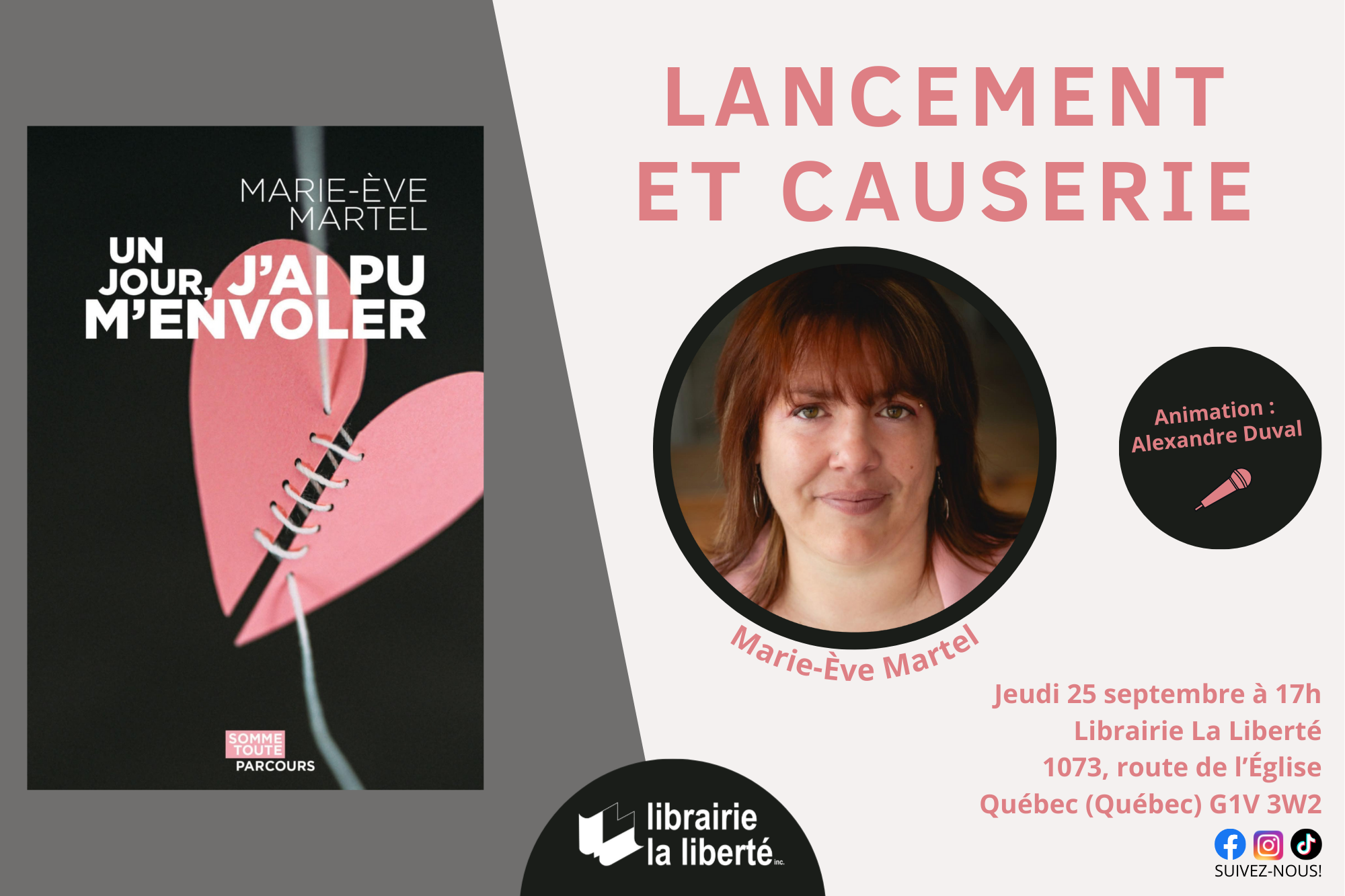 Rencontrez Marie-Ève Martel lors d’une causerie à propos de son nouveau livre « Un jour, j’ai pu m’envoler » (Somme toute, septembre 2025). Les échanges, animés par Alexandre Duval, seront suivis d’une séance de dédicaces.
