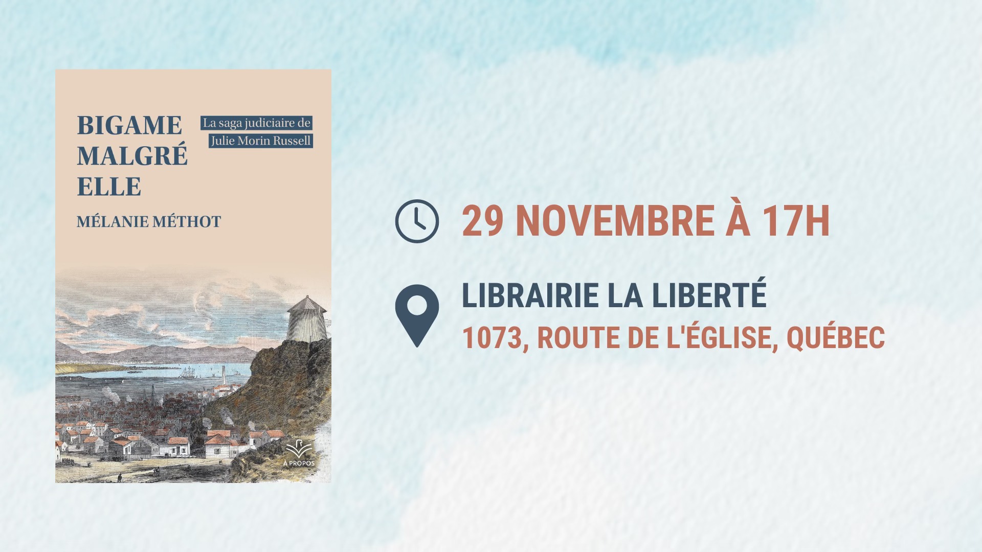 Les Presses de l’Université Laval sont heureuses de vous inviter à cette soirée historique à l’occasion du lancement de l’ouvrage «Bigame malgré elle : la saga judiciaire de Julie Morin Russell » de Mélanie Méthot. Pour l’occasion, l’autrice sera accompagnée de l’historien et professeur Donald Fyson. Les deux échangeront sur l’incroyable histoire de Julie Morin Russell ainsi que sur cette période historique.