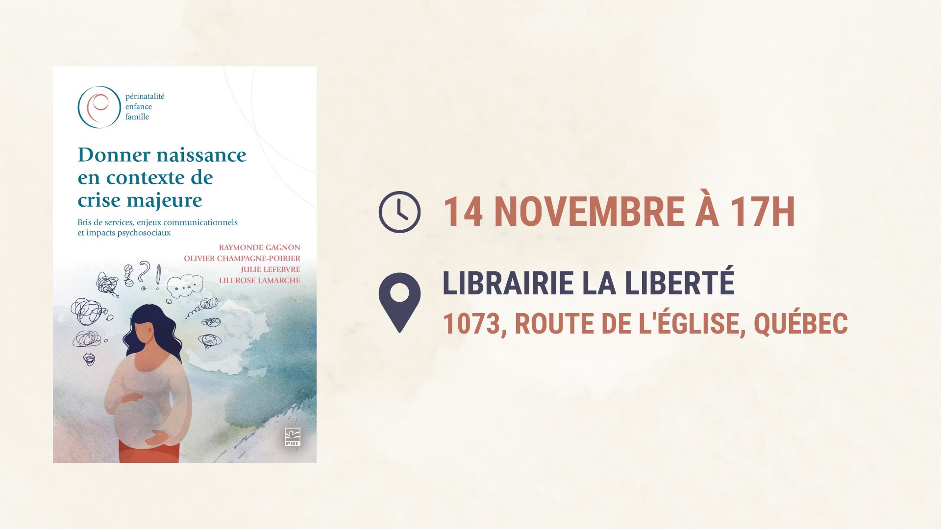 Les Presses de l’Université Laval sont heureuses de vous inviter à cette causerie autour du nouvel ouvrage «Donner naissance en contexte de crise majeure» de Raymonde Gagnon, Olivier Champagne-Poirier, Julie Lefebvre et Lili Rose Lamarche. La soirée sera animée par Claudia Prevost.