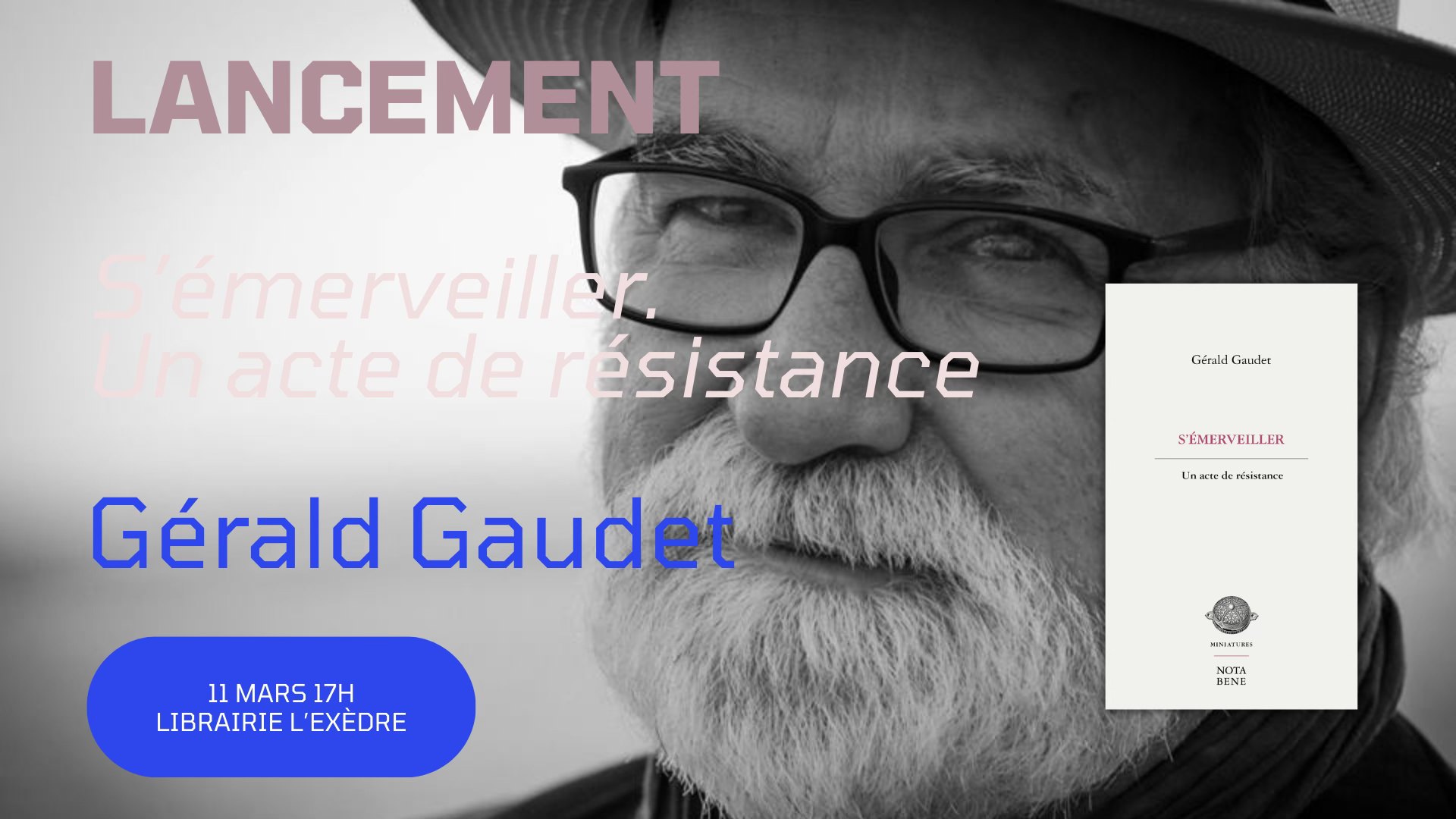 Les éditions Nota Bene ont le plaisir de vous inviter à la librairie l’Exèdre, le mercredi 11 mars dès 17 h, pour célébrer la parution de S’ÉMERVEILLER. Un acte de résistance de Gérald Gaudet. 🌟
