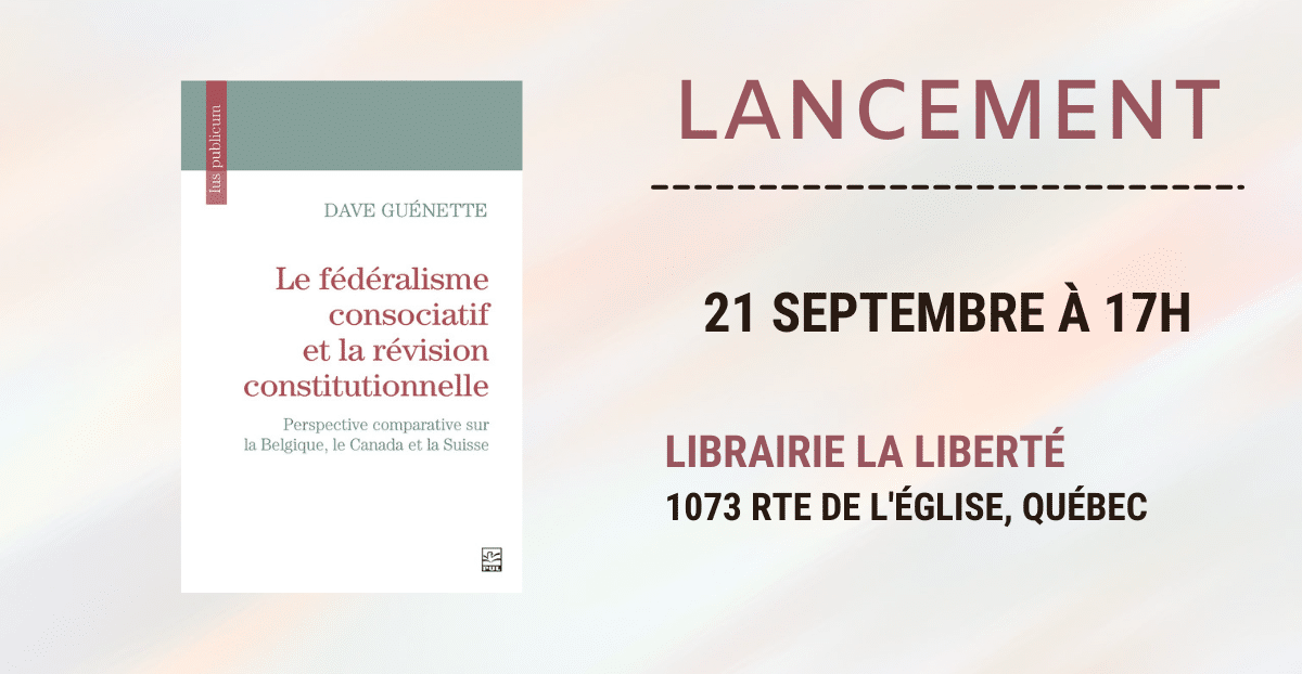 Les Presses de l’Université Laval sont heureuses de vous inviter au lancement de l’ouvrage «Le fédéralisme consociatif et la révision constitutionnelle» de Dave Guénette. C’est l’occasion parfaite pour venir discuter avec l’auteur de ce projet qui est l’aboutissement de son doctorat.