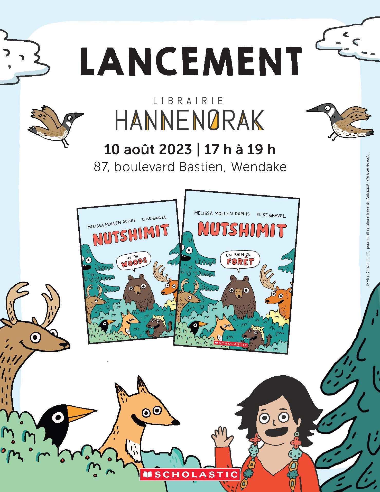 Les Éditions Scholastic, en collaboration avec la Librairie Hannenorak, sont heureuses de vous inviter au lancement du livre documentaire jeunesse très attendu Nutshimit : Un bain de forêt, écrit par Melissa Mollen Dupuis et illustré par Elise Gravel.🥳 L’événement aura lieu sous forme de 5 à 7 à la Librairie Hannenorak, au 87, boulevard Bastien, à Wendake, le 10 août 2023. 📚 Au plaisir de vous y voir!
