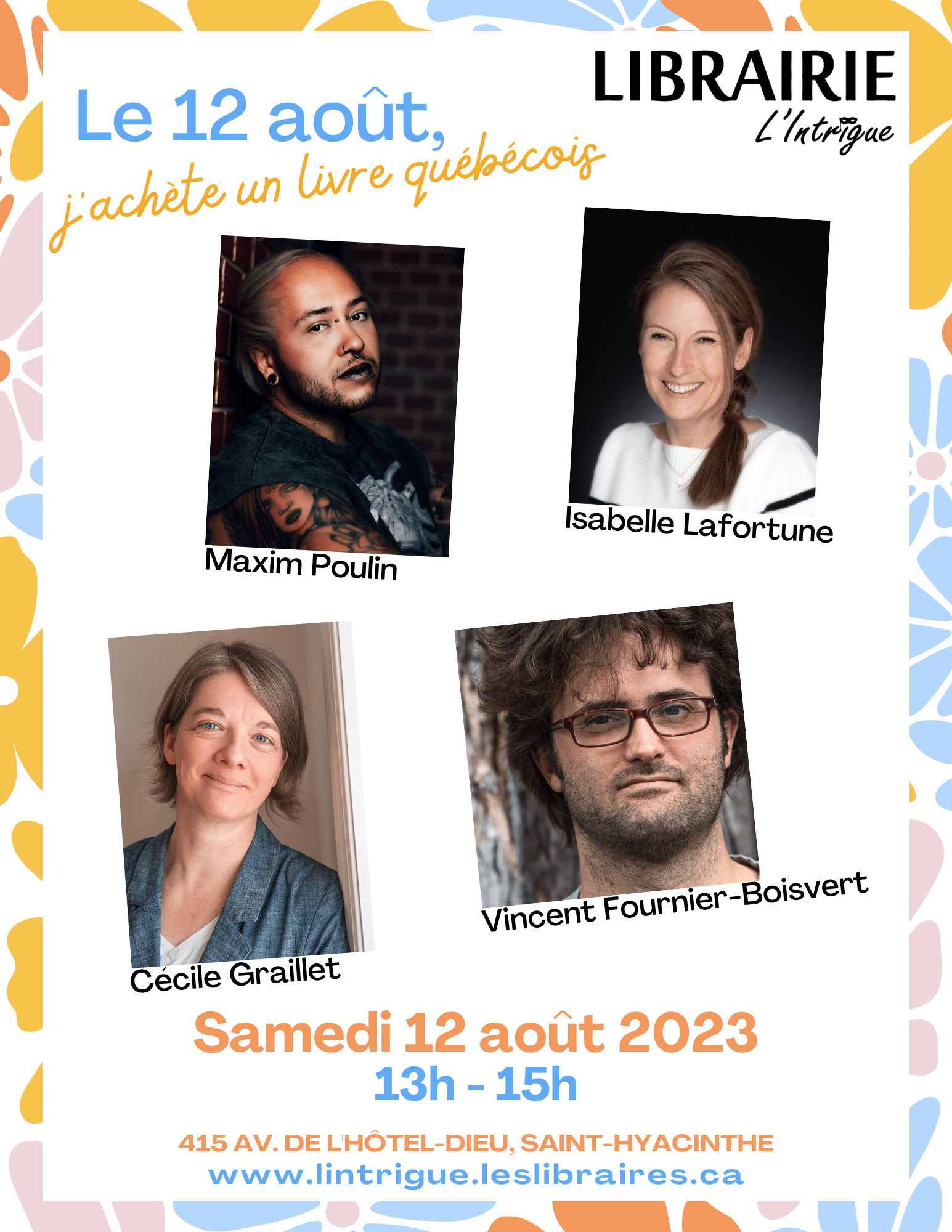 Venez rencontrer les auteurs Maxim Poulin, Isabelle Lafortune, Cécile Graillet et Vincent Fournier-Boisvert à l’occasion de la journée Le 12 août, j’achète un livre québécois!