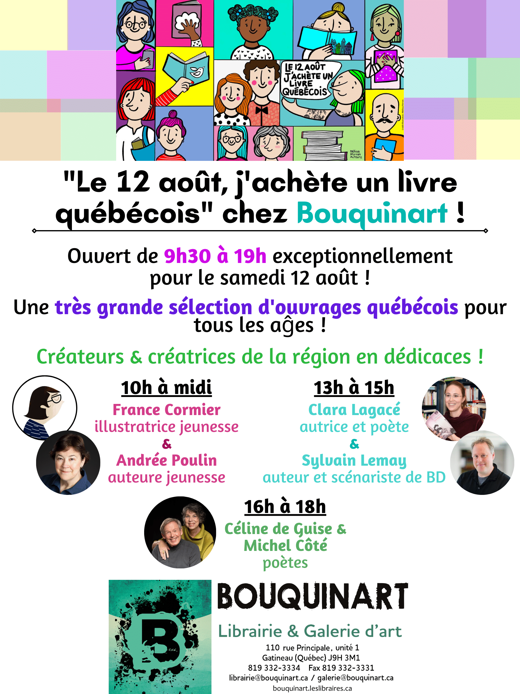 Pour la 10e édition de l’événement provincial « Le 12 août, j’achète un livre québécois », on vous réserve une journée avec des créateurs et créatrices de l’Outaouais, des livres (beaucoup de livres !) québécois, nos suggestions de lectures préférées, des livres à gagner et des heures d’ouverture plus longues pour bouquiner encore plus longtemps ! En effet, Bouquinart sera OUVERT de 9h30 à 19h.