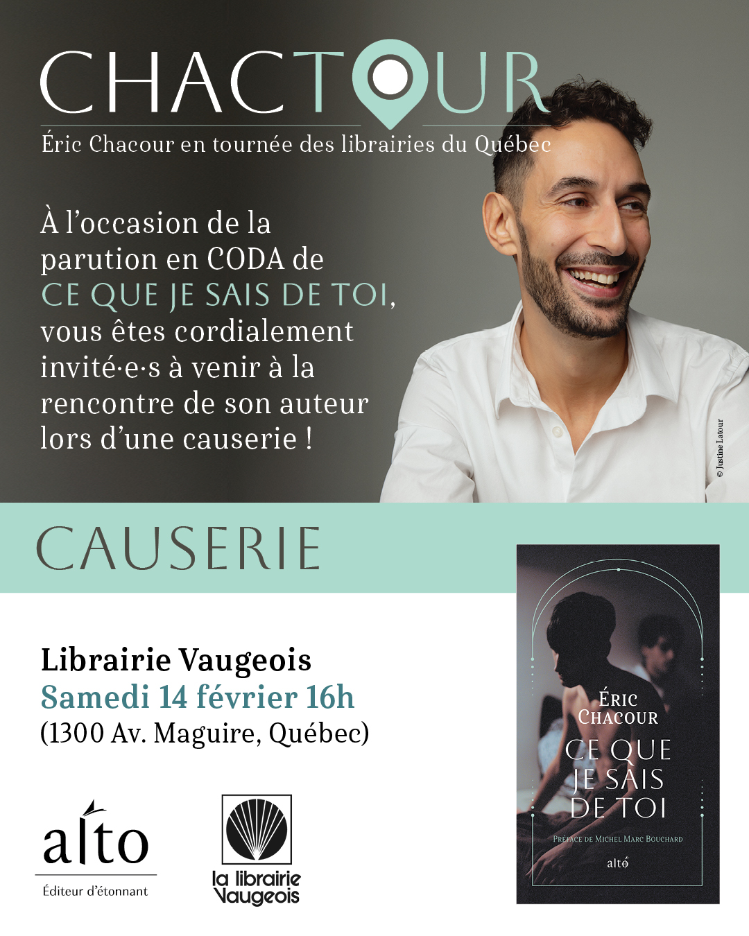 Éric Chacour sera avec nous à la Saint-Valentin pour célébrer la parution de Ce que je sais de toi dans une édition compacte. La causerie sera suivie d’une séance de signature. L’occasion parfaite pour échanger avec cet auteur dont le premier roman a ému beaucoup de lecteurs.
