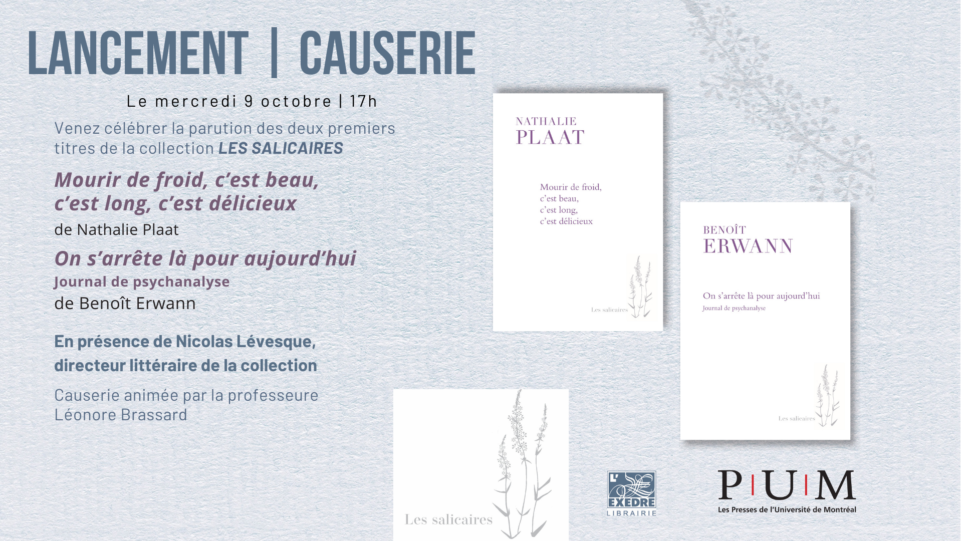 C’est avec plaisir que la librairie l’Exèdre vous convie le mercredi 9 octobre dès 17h pour découvrir la nouvelle collection des Presses de l’Université de Montréal Les Salicaires, dirigée par l’auteur et psychanalyste Nicolas Lévesque. Benoit Erwann et Nathalie Plaat, les deux premiers auteurs de la collection présenteront leur ouvrage respectif, lors d’une causerie animée par Léonore Brassard, professeure au département de lettres et communication sociale de l’UQTR.