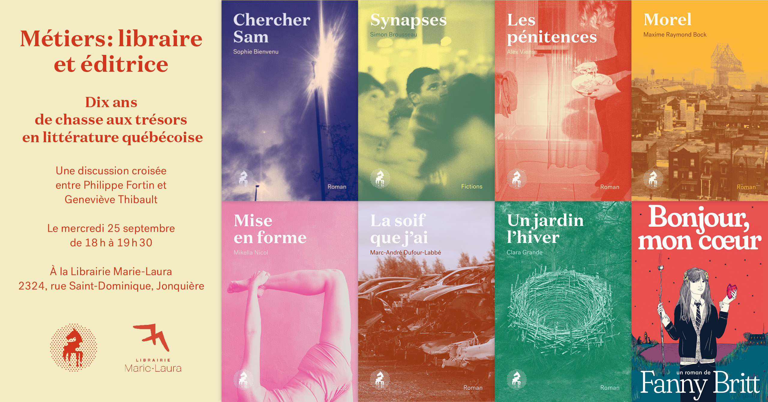 À l’occasion de ses 10 ans, Le Cheval d’août vous convie à une discussion croisée entre son éditrice et fondatrice Geneviève Thibault et Philippe Fortin, libraire de l’année 2024, à la librairie Marie-Laura de Jonquière. Philippe et Geneviève évoqueront leurs métiers respectifs et l’esprit de découverte qui les anime, toujours à l’affût de voix nouvelles et originales à lire, publier et défendre.