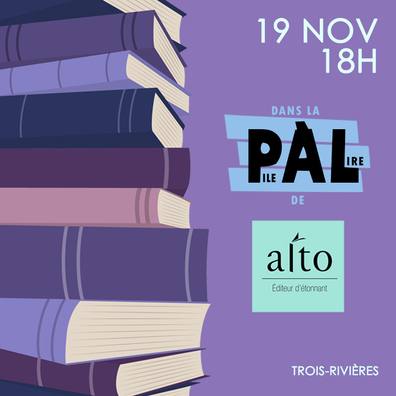 Le 19 novembre à 18h à la succursale de Trois-Rivières, découvrez ce que les éditions Alto vous suggère d’ajouter à votre pile à lire! La maison d’édition derrière des incontournables tels que Ce que je sais de toi (Chacour, 2023), Autoportrait d’une autre (Turcotte, 2023) et Moi, ce que j’aime, c’est les monstres (Ferris, 2018), L’orangeraie (Tremblay, 2016) avec des auteur.es tel.les que Dominique Fortier (Les villes de papier, Du bon usage des étoiles, La part de l’océan), David Mitchell (Utopia avenue, L’âme des horloges, L’atlas des nuages), Nicolas Dickner, Martine Desjardins, Hélène Dorion, Audrey Wilhelmy ou encore Eleanor Catton, pour n’en nommer que quelques un.es.