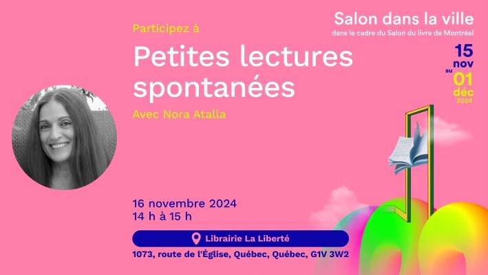Rencontrez Nora Atalla à la Librairie La Liberté. Elle offrira des petites lectures spontanées et rédigera quelques poèmes sur place.