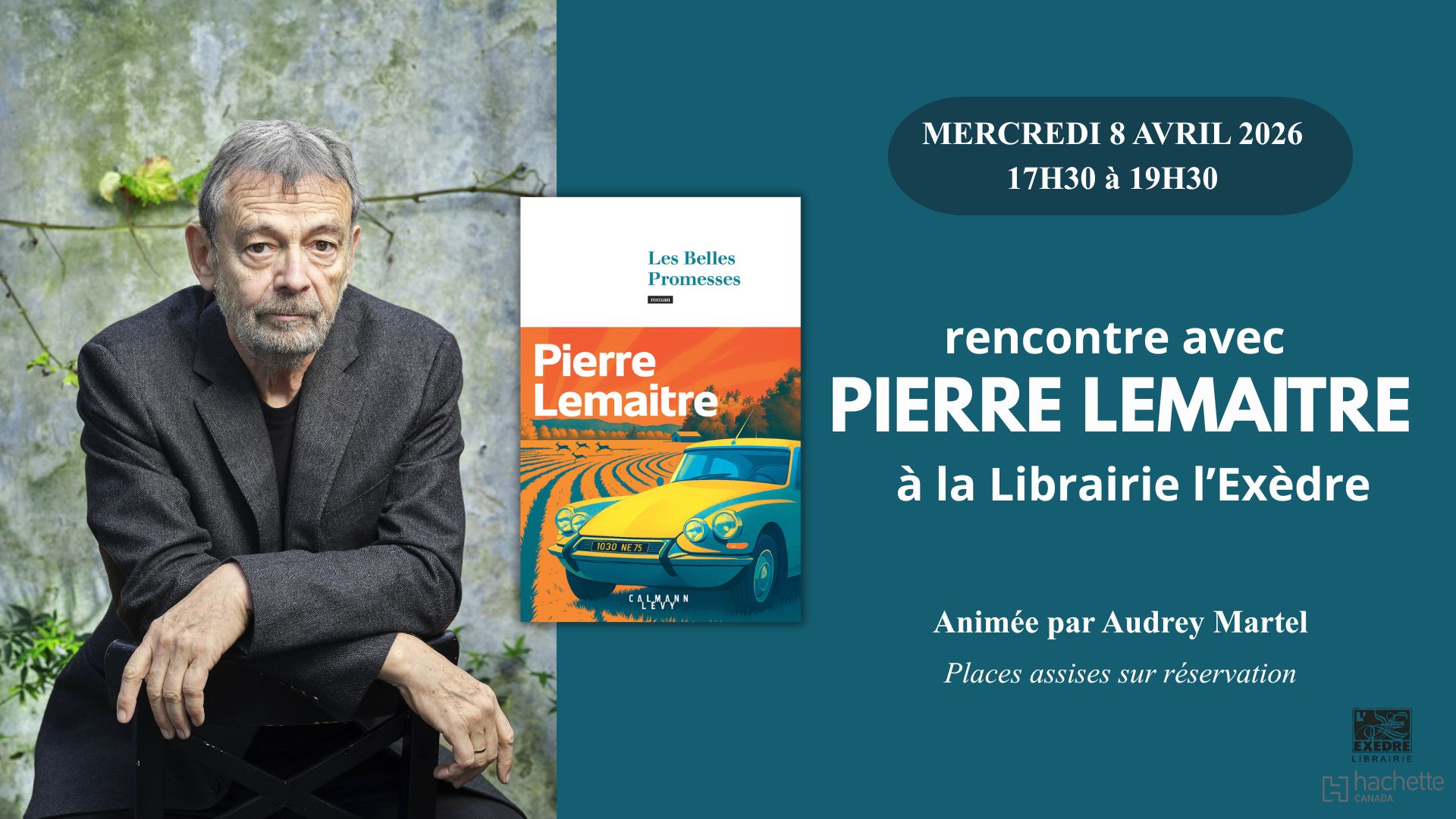La Librairie l’Exèdre et Hachette Canada ont le grand plaisir de vous inviter à une soirée exceptionnelle en compagnie de l’écrivain Pierre Lemaitre, à l’occasion de la parution de son plus récent roman Les Belles Promesses.