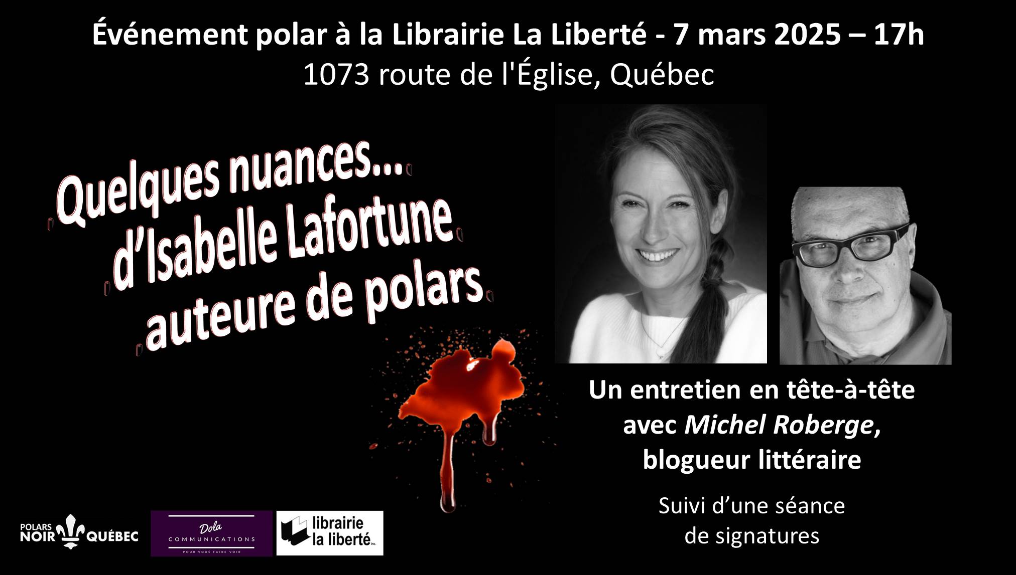 La Librairie La Liberté vous invite à découvrir « Quelques nuances… d’Isabelle Lafortune », auteure de polars, en tête-à-tête avec Michel Roberge, blogueur littéraire.