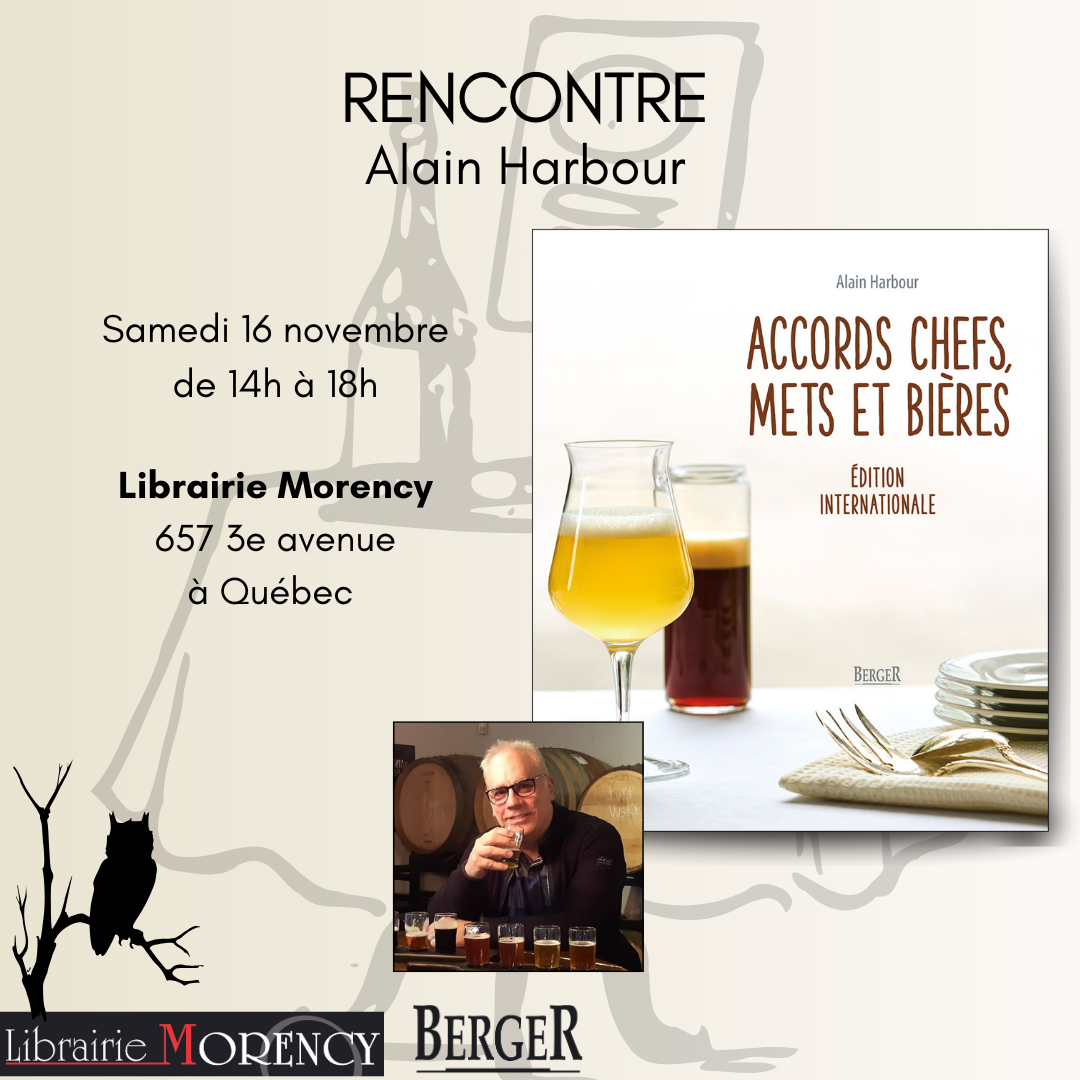 À l’occasion de la sortie du livre de cuisine Accords chefs : mets et bières aux éditions Berger, l’auteur Alain Harbour sera présent à la librairie Morency le samedi 16 novembre de 14h à 18h, accompagné de l’un des chefs québécois mentionné dans le livre.