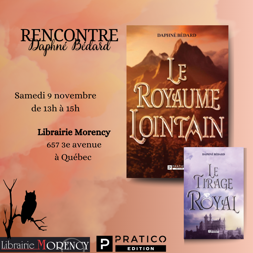 Le 4 novembr prochain, Le Royaume Lointain, suite du Tirage Royal sera disponible en librairie ! À cette occasion, l’auteure Daphné Bédard sera présente à la librairie Morency le samedi 9 novembre de 13h à 15h pour vous faire découvrir son univers
