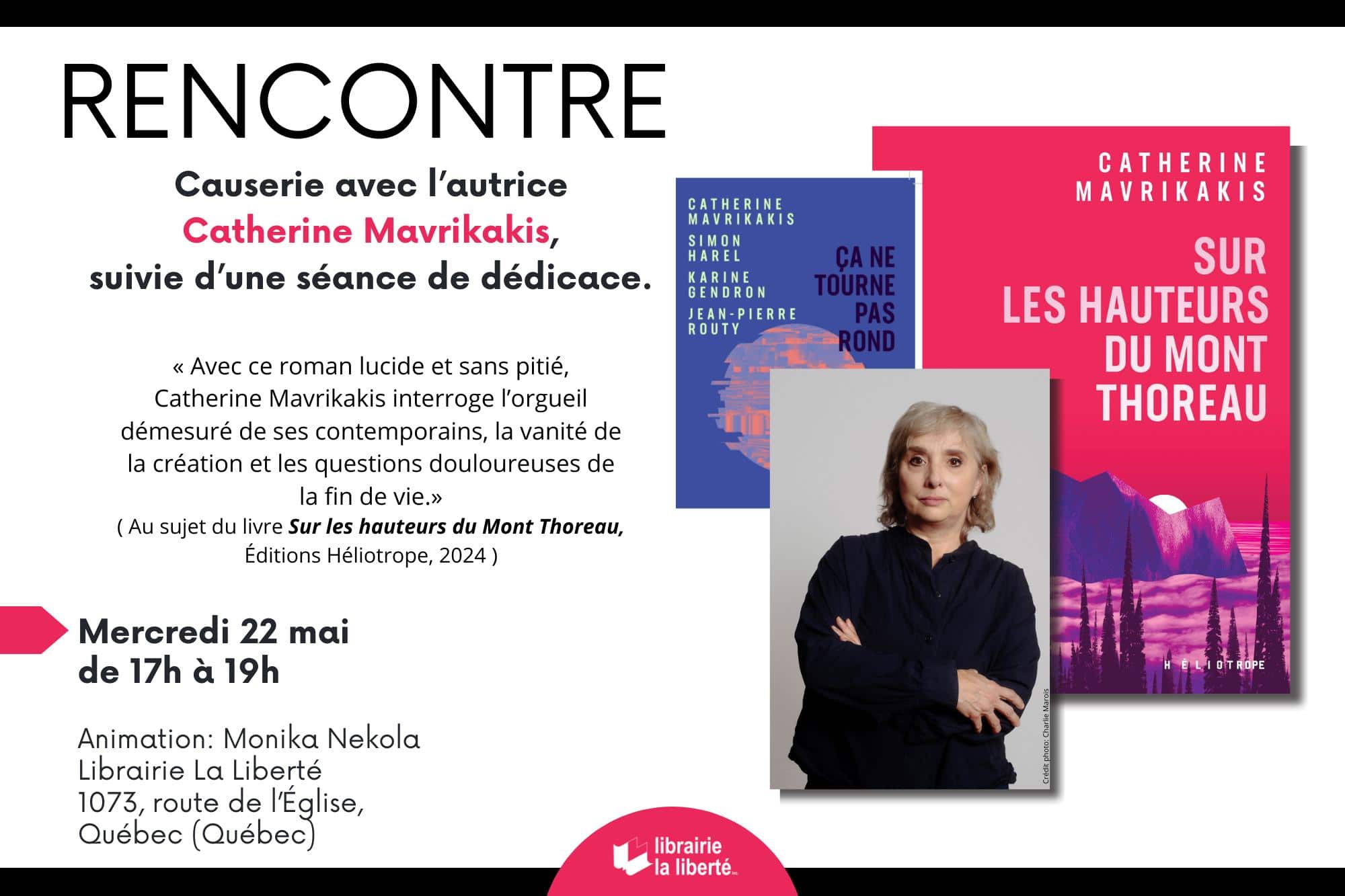 Rencontrez l’autrice Catherine Mavrikakis lors d’une causerie entourant la parution de ses derniers livres, particulièrement son roman SUR LES HAUTEURS DU MONT THOREAU (Éditions Héliotrope, avril 2024). Les échanges, animés par notre libraire Monika Nekola, seront suivis d’une séance de dédicaces.