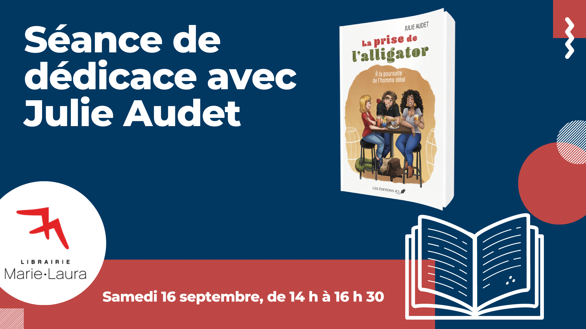 Dans la foulée de la parution du roman La prise de l’alligator, aux éditions JCL, l’autrice Julie Audet, qui réside à St-Ambroise, sera à la librairie pour dédicacer des exemplaires du livre et discuter avec le public. Au plaisir de vous y voir !