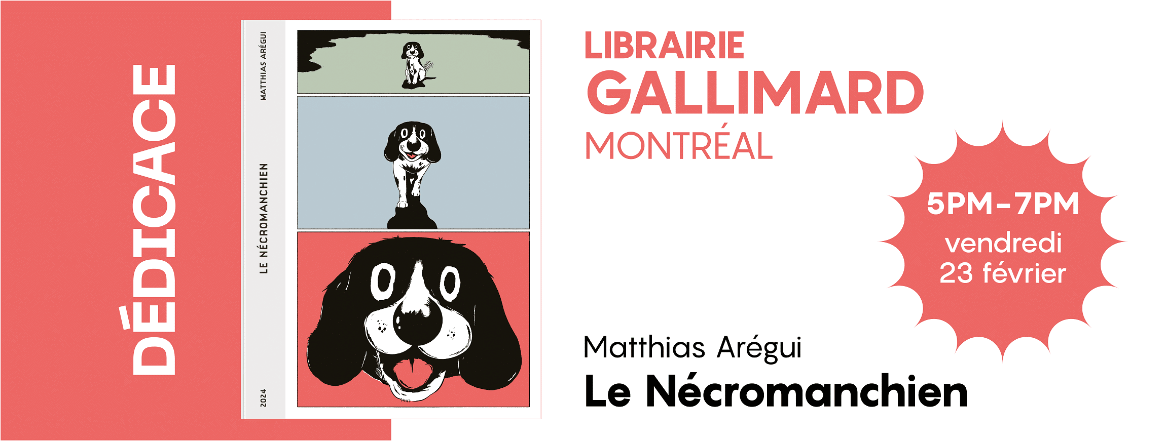 Le bédéiste Matthias Arégui sera de passage à la Librairie Gallimard à l’occasion de la parution aux Éditions 2024 de sa plus récente et fabuleuse bande dessinée « Le Nécromanchien ». Au programme, dédicace et discussion avec l’auteur sélectionné récemment à Angoulême!