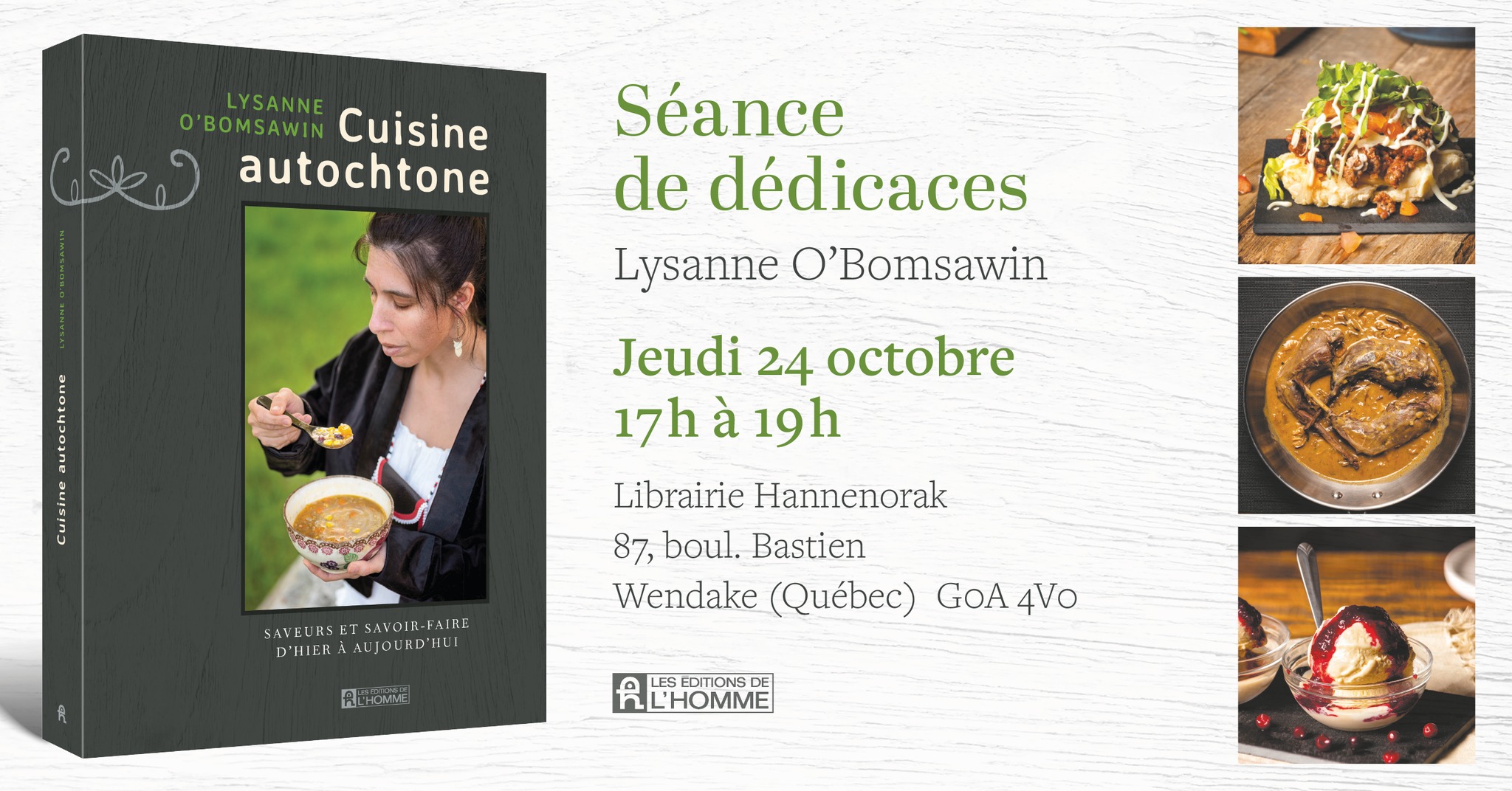 Rencontrez Lysanne O’Bomsawin lors de sa séance de dédicaces à la Librairie Hannenorak pour son livre Cuisine autochtone!
