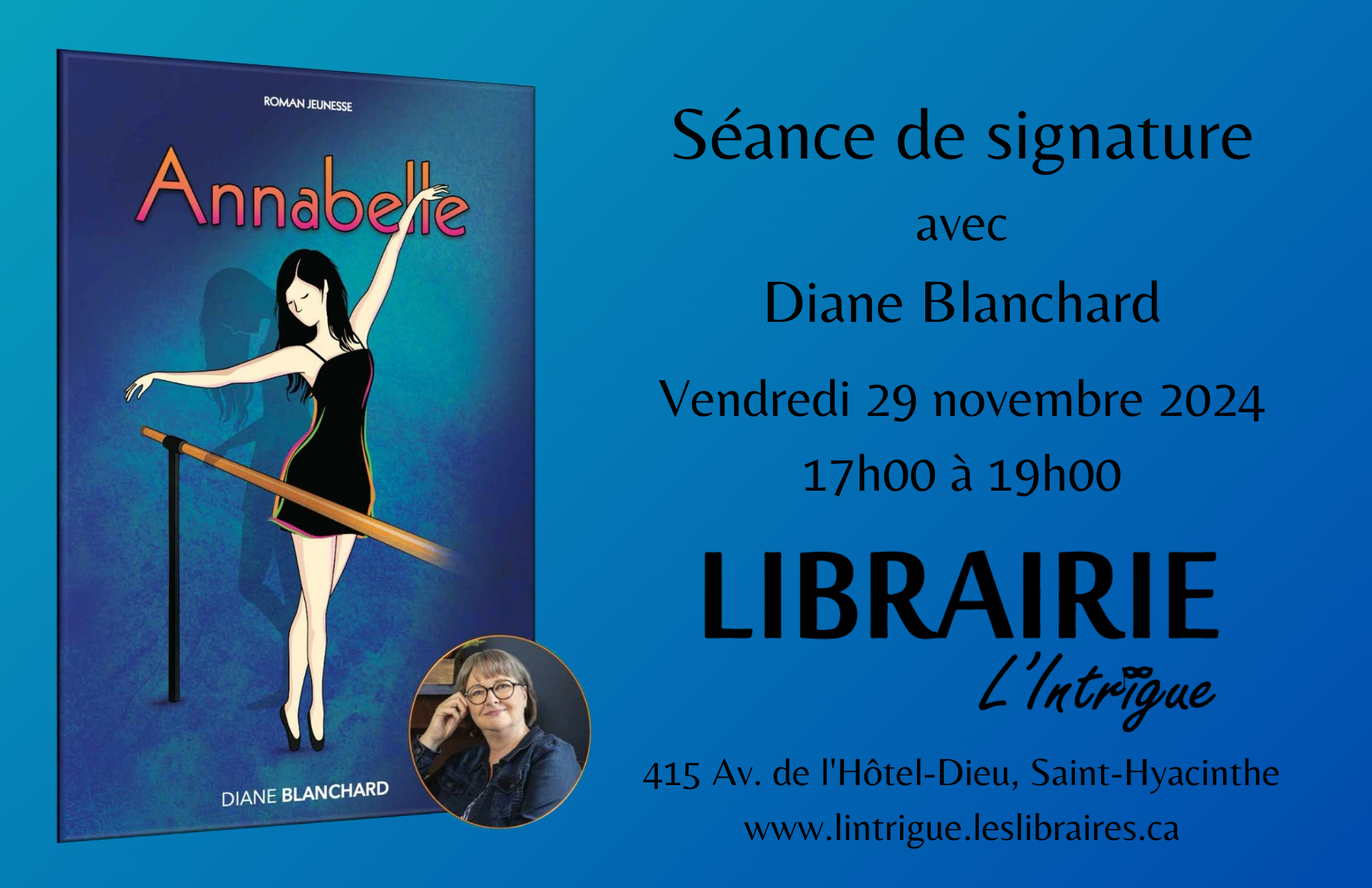 Le 29 novembre prochain, de 17h à 19h, nous recevrons l’auteure Diane Blanchard pour une séance de signature pour son premier roman jeunesse Annabelle.