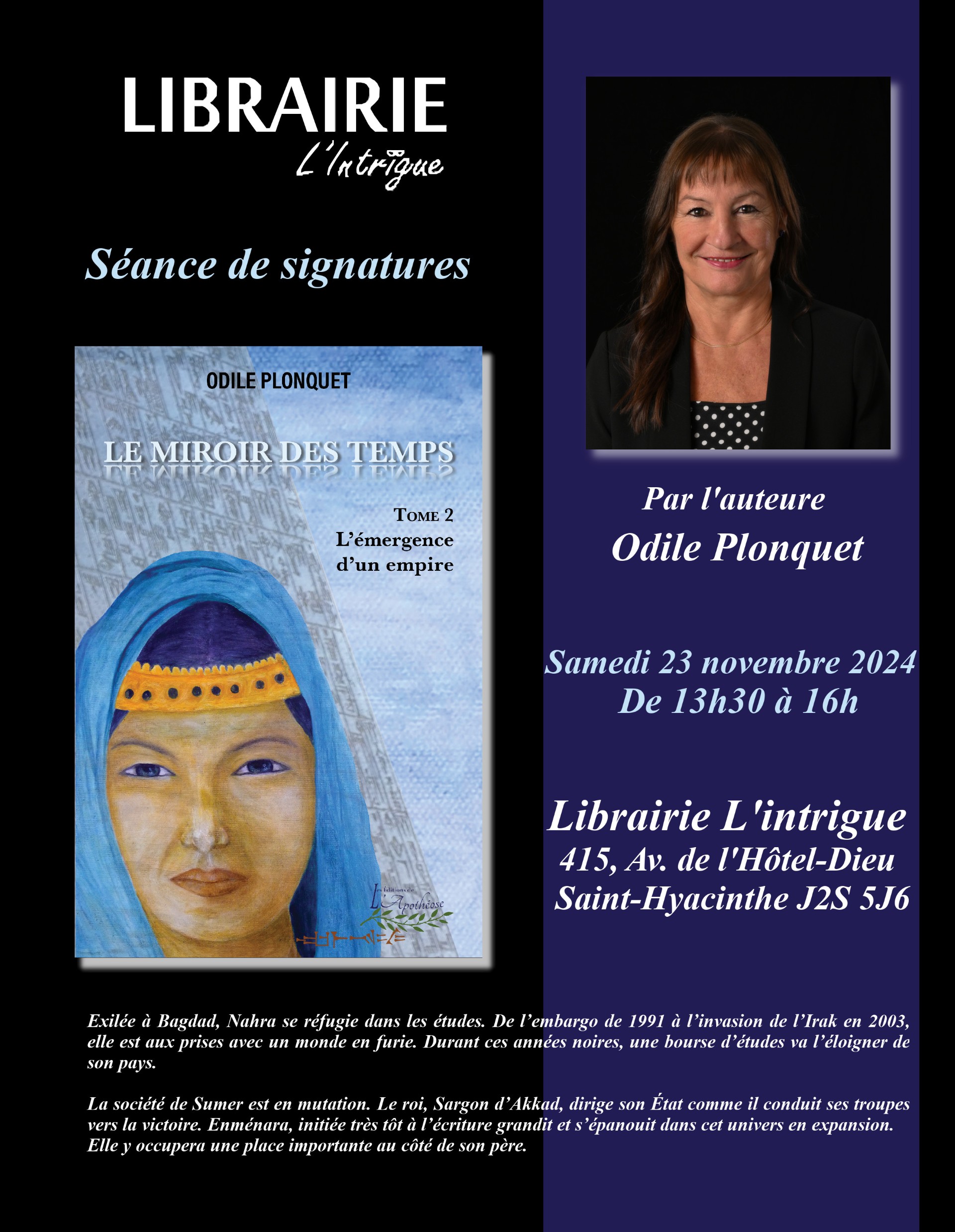 Le 23 novembre prochain, de 13 h 30 à 16 h, nous recevrons l’auteure Odile Plonquet pour une séance de signatures pour son roman Le miroir des temps T.2 : L’émergence d’un empire.