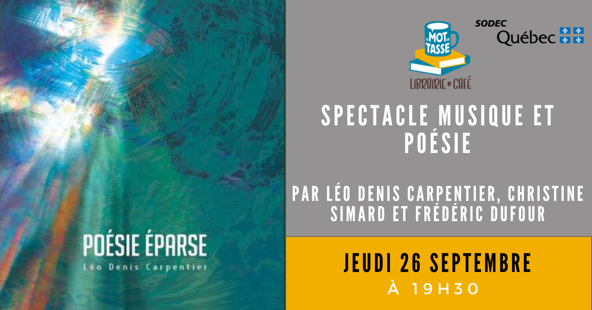 Venez assister au spectacle du poète Léo Denis Carpentier, qui lira des textes de son recueil Poésie éparse, et de Christine Simard, qui chantera accompagnée par Frédéric Dufour à la musique.