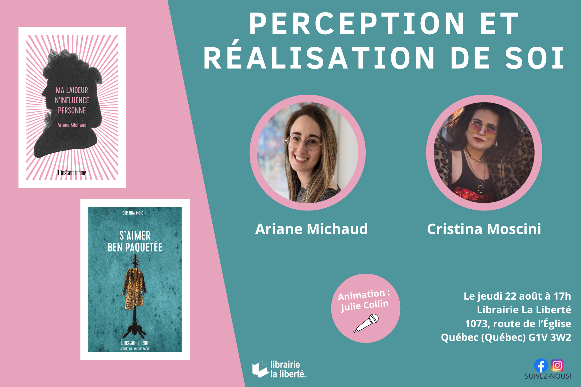 Assistez à la table ronde « Perception et réalisation de soi », à laquelle participeront les autrices Ariane Michaud (Ma laideur n’influence personne, L’instant même, 2024) et Cristina Moscini (S’aimer ben paquetée, L’instant même, 2023). Les échanges seront animés par notre libraire Julie Collin.