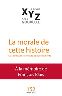 Piloté par David Bélanger, ce numéro de la revue XYZ est dédié à la mémoire de François Blais, qui y signe un de ses derniers textes, une nouvelle inédite publiée à titre posthume : un conte ironique sur l’avidité et la cupidité. Rassemblant entre autres des textes de J. D. Kurtness, Ariane Lessard, Kiev Renaud et Antoine Desjardins, cette édition réinvente l’idée voulant qu’« on ne fait pas de littérature avec de bons sentiments » en s’inspirant du thème « La morale de cette histoire ». Après avoir joué avec les codes et la mécanique de la morale, le prochain numéro, qui paraîtra le 20 février, s’articulera autour du thème « Gothique ».